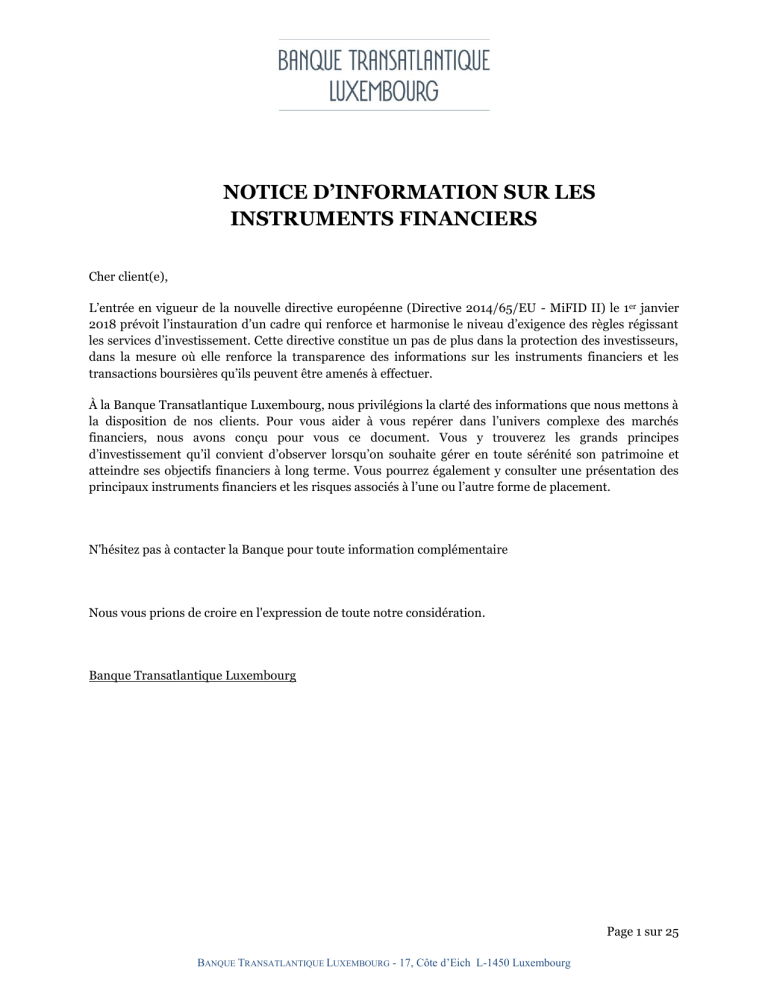 BANQUE TRANSATLANTIQUE LUXEMBOURG - 17, Côte d’Eich L-1450 Luxembourg