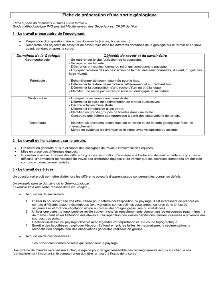 Fiche de préparation d’une sortie géologique