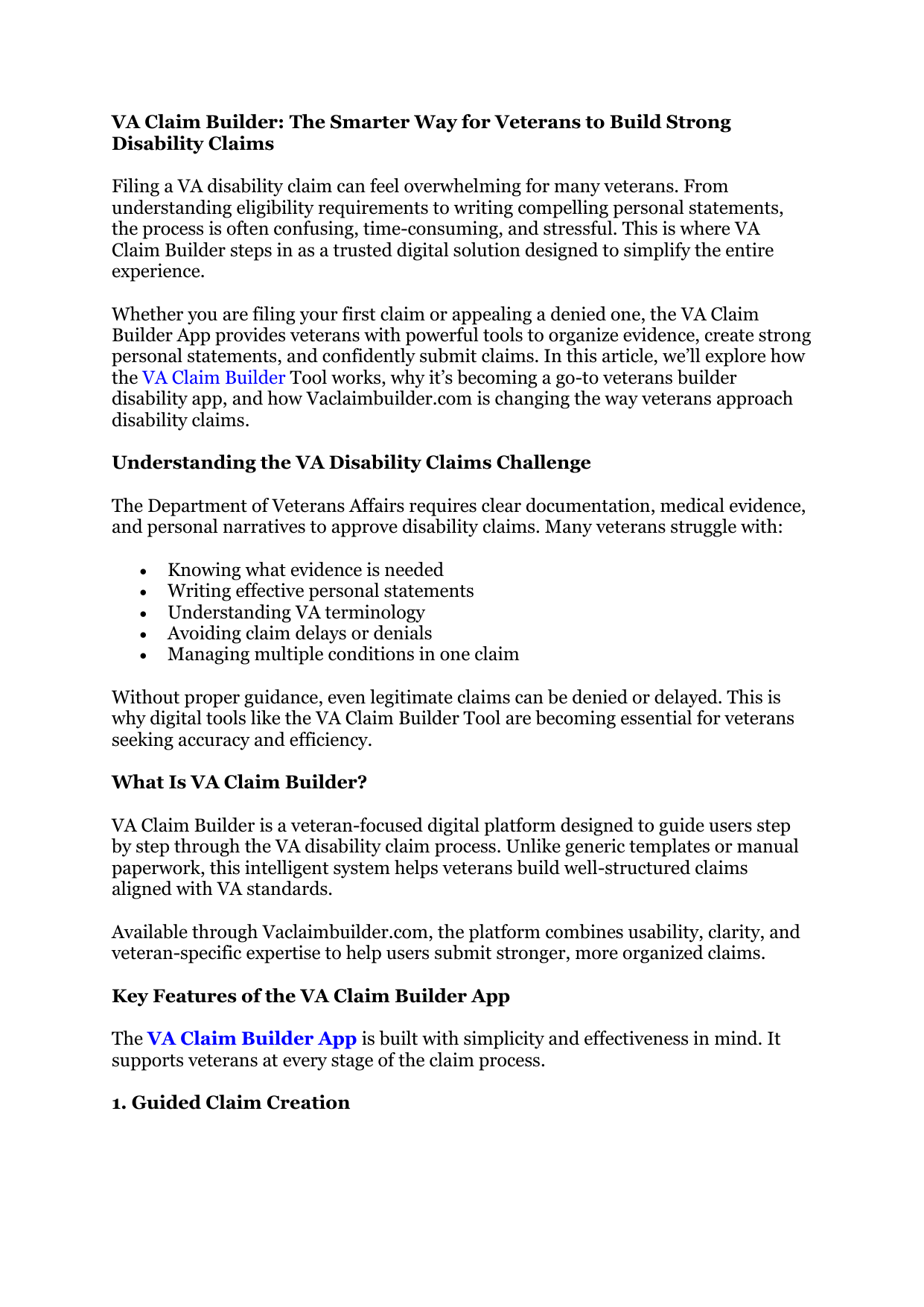 VA Claim Builder is a veteran-focused digital platform designed to guide users step