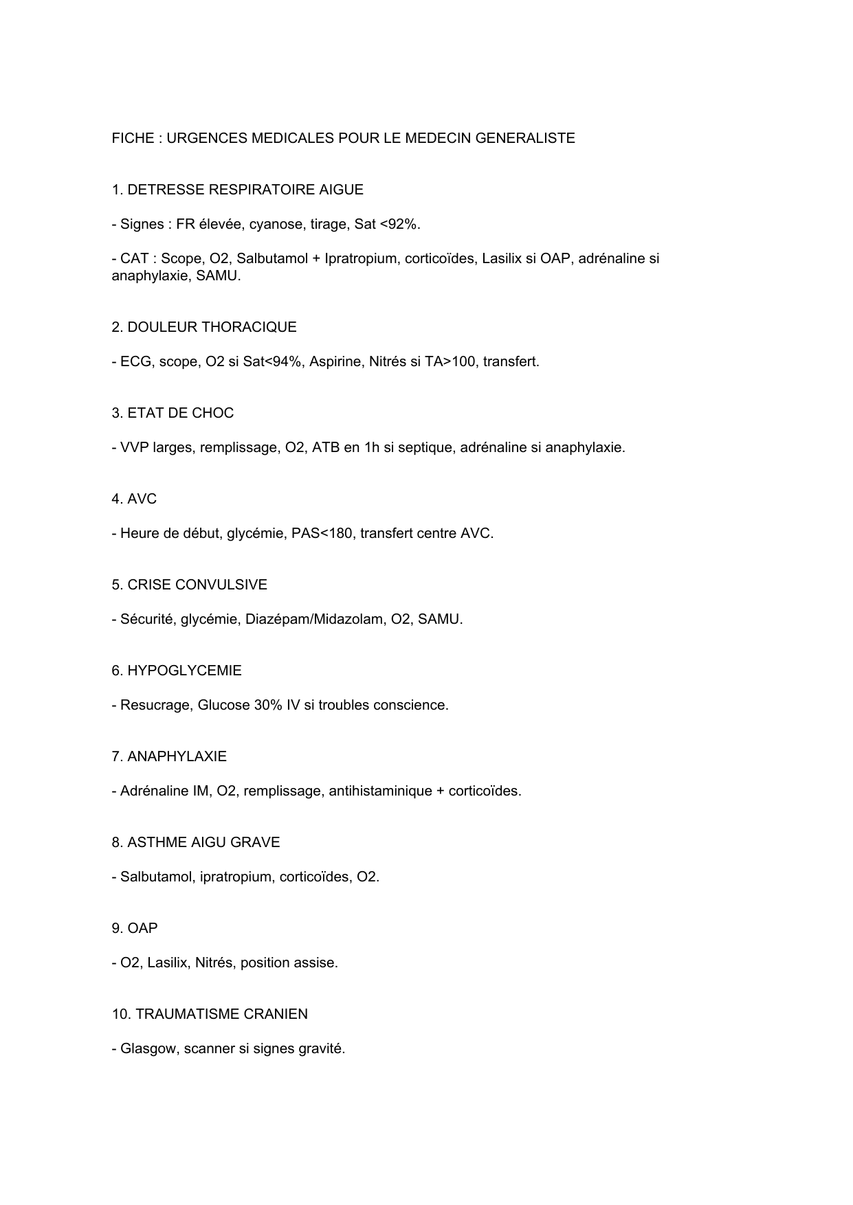 FICHE : URGENCES MEDICALES POUR LE MEDECIN GENERALISTE