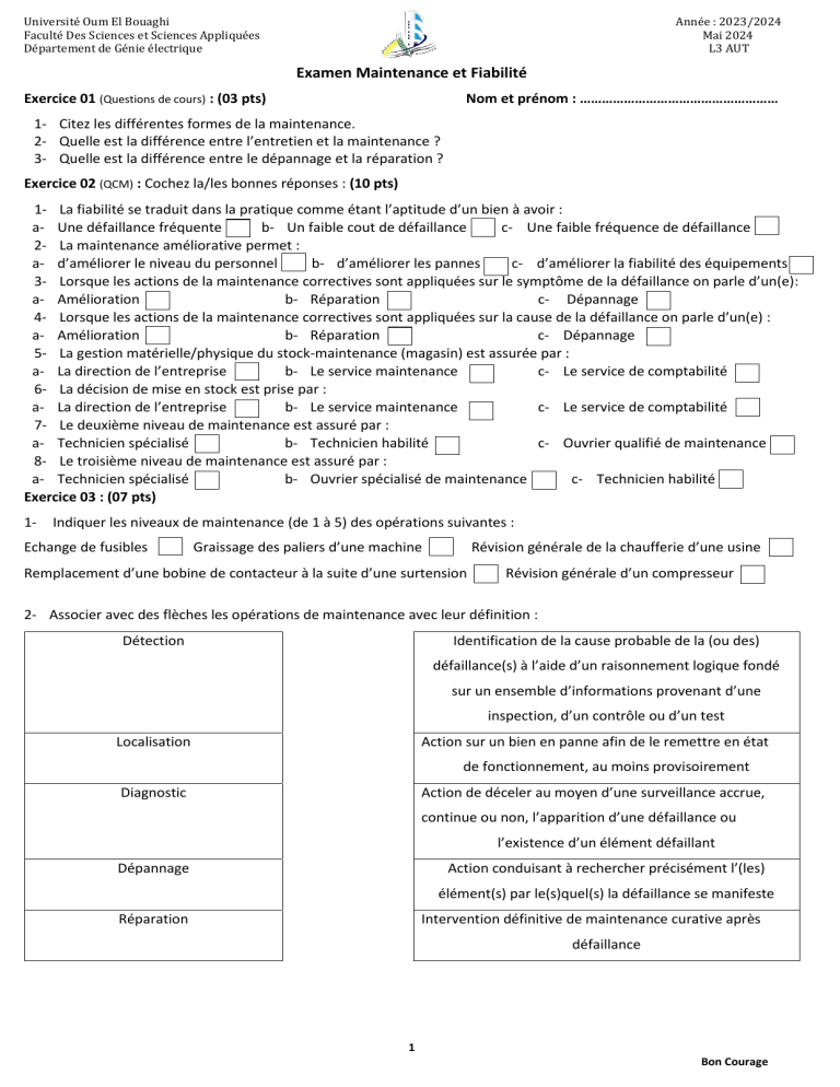 Exercice 01 (Questions de cours) : (03 pts) Nom et prénom : ………………………………………………