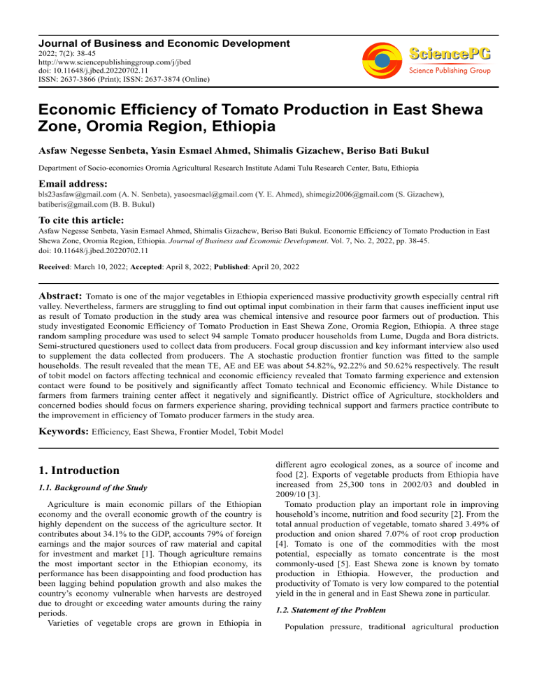 Asfaw Negesse Senbeta, Yasin Esmael Ahmed, Shimalis Gizachew, Beriso Bati Bukul. Economic Efficiency of Tomato Production in East