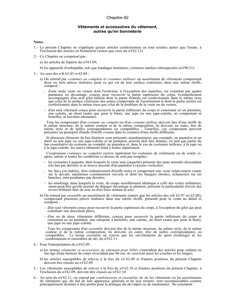 6.- Au sens du n°62.11, on entend par combinaisons et ensembles de ski les vêtements ou les assortiments