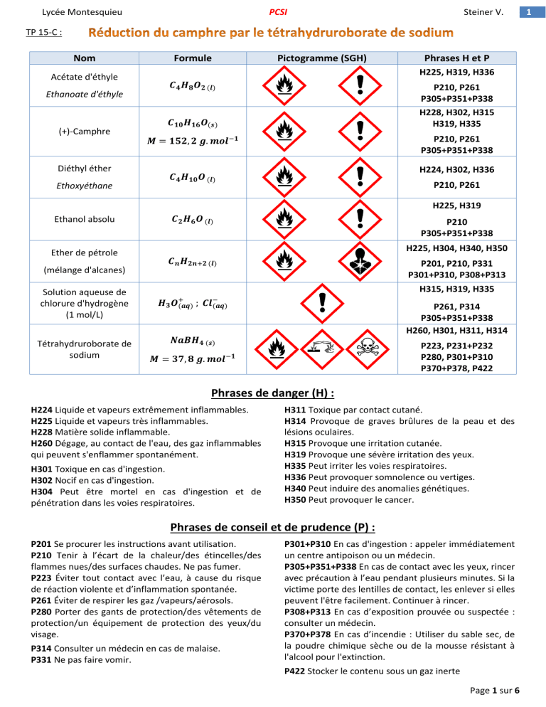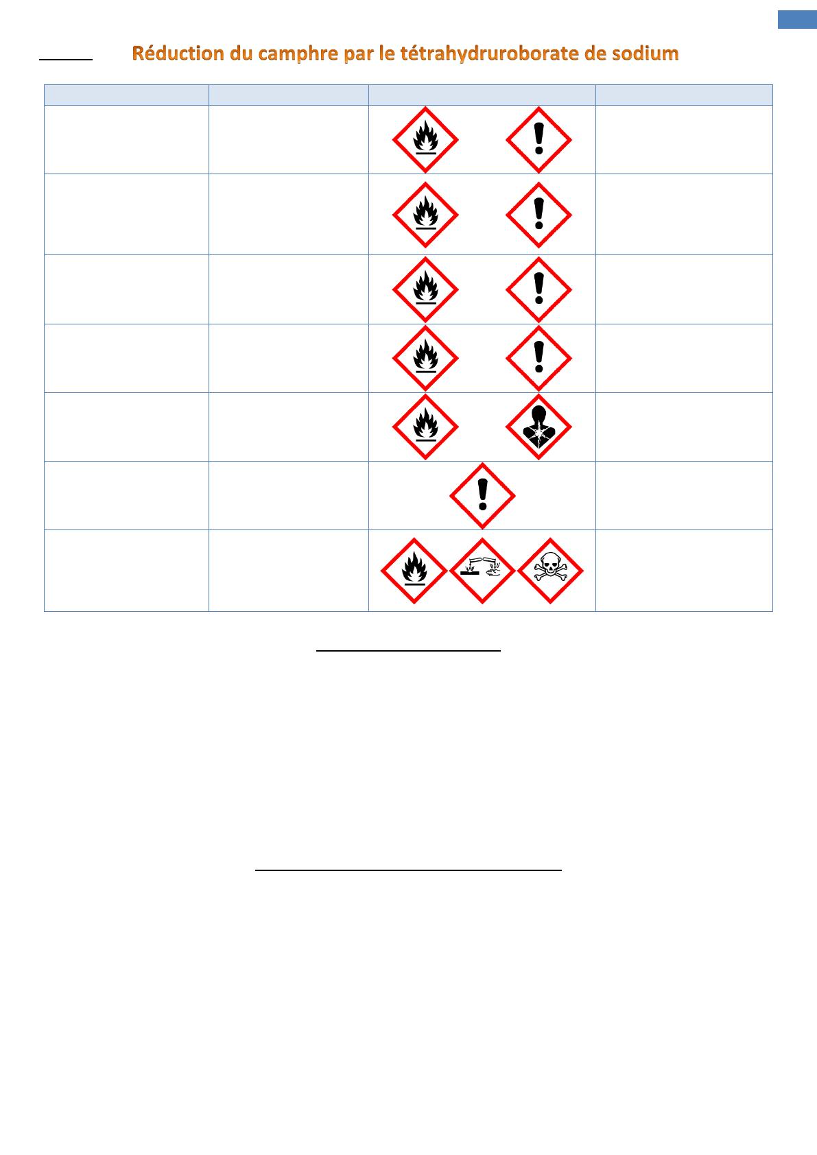 de tétrahydruroborate de sodium (NaBH4) sous une sorbonne (☠) et l'ajouter à la solution de camphre tout en