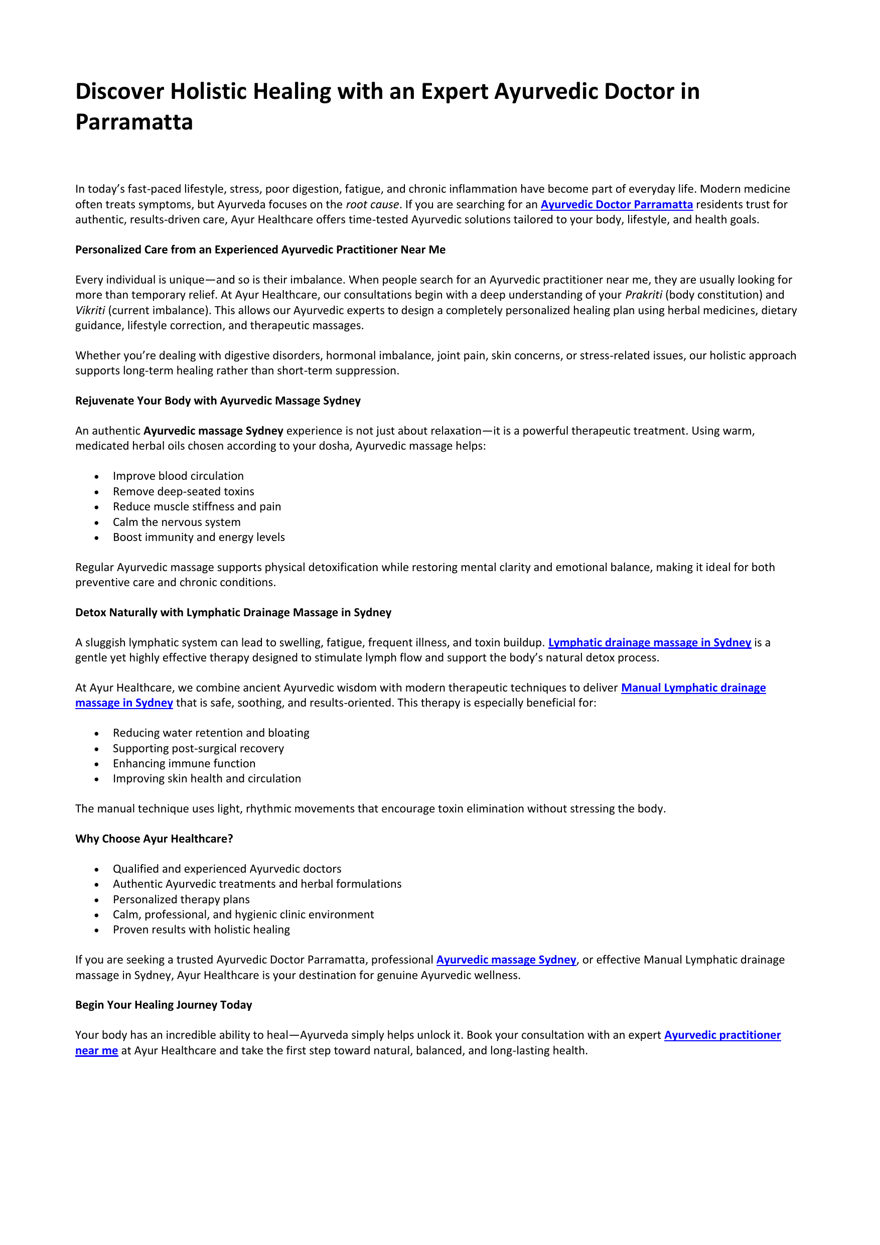 If you are seeking a trusted Ayurvedic Doctor Parramatta, professional Ayurvedic massage Sydney, or effective Manual Lymphatic drainage