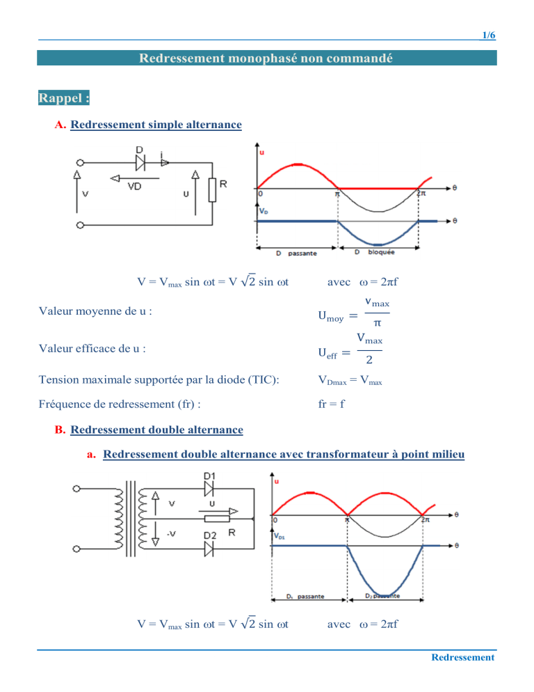 2. Calculer les valeurs moyennes de la tension uR, le courant iR, le courant iD1 et le