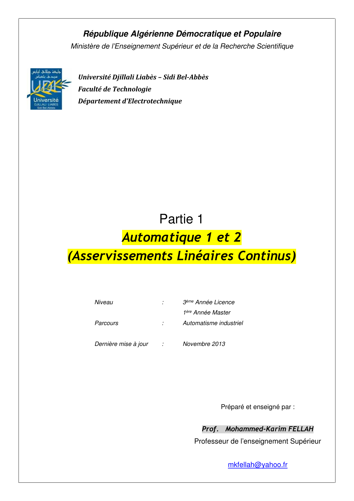 Cours d’asservissements linéaires continus (2013-2014) Licence et Master « Automatisme Industriel » (Prof. FELLAH M.K.) 5