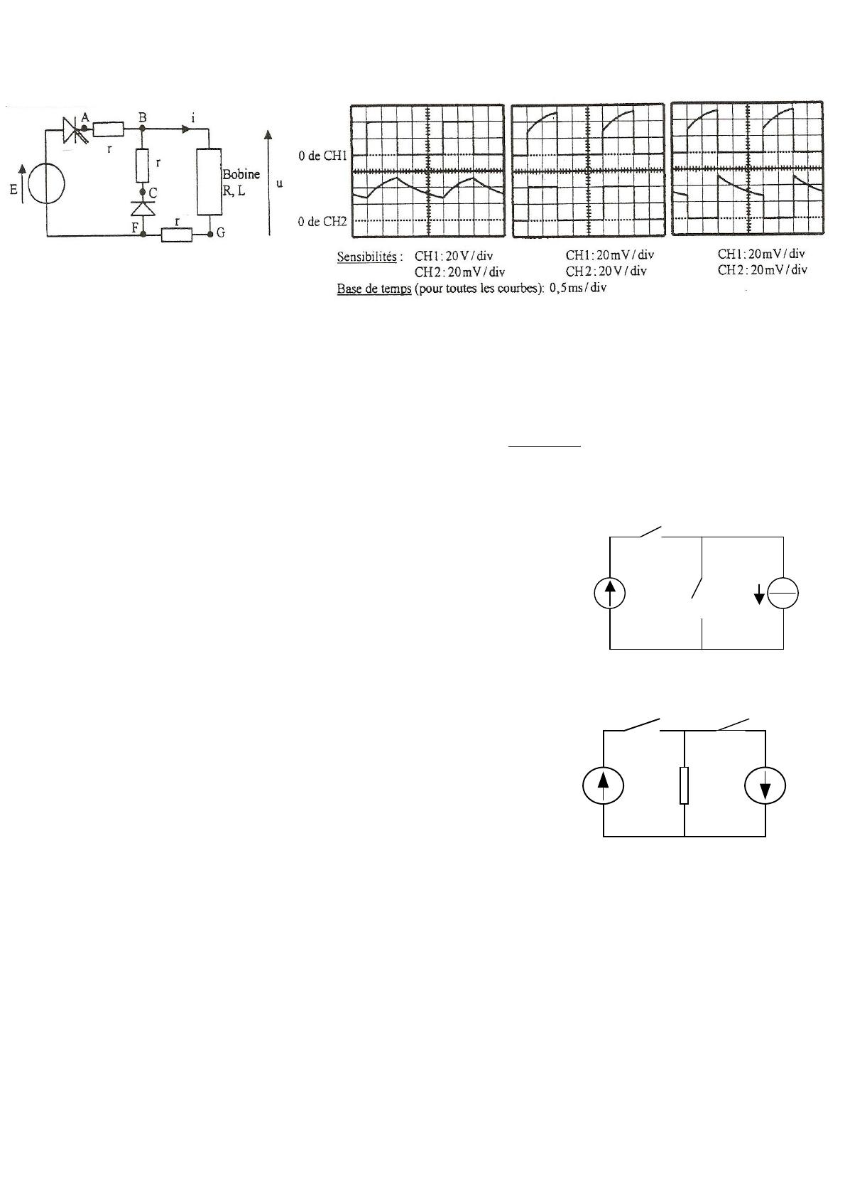 On relève les trois oscillogrammes suivants avec trois branchements différents de l’oscilloscope :