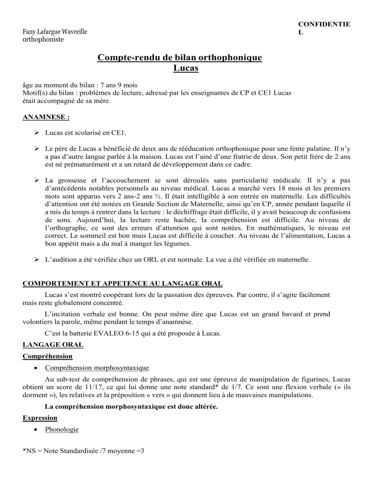 Motif(s) du bilan : problèmes de lecture, adressé par les enseignantes de CP et CE1 Lucas