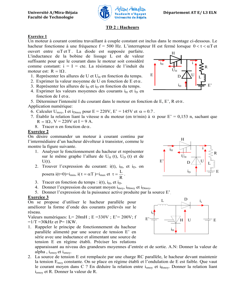 Valeurs numériques: L= 20mH ; E =330V ; E’= 200V; f