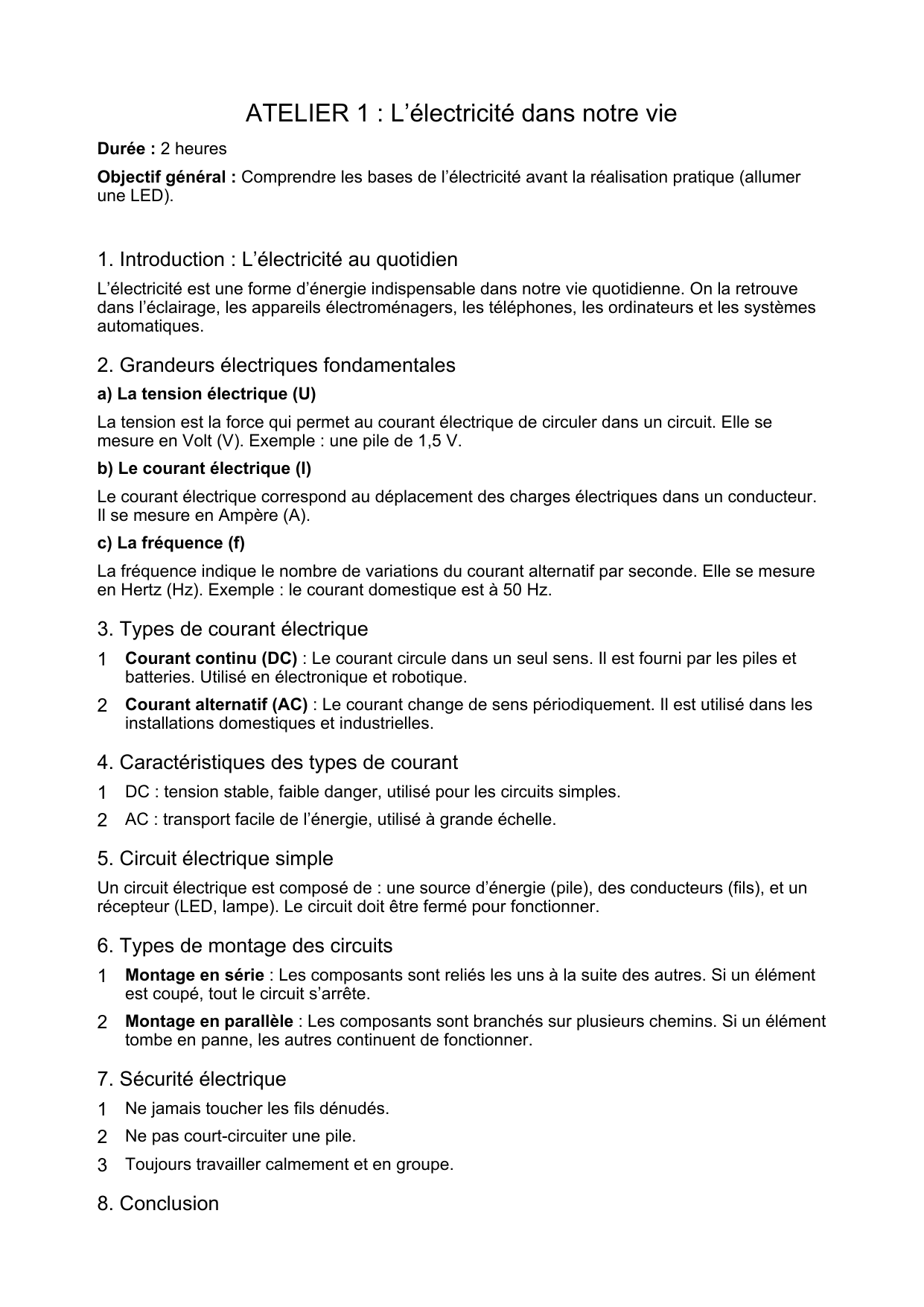 Objectif général : Comprendre les bases de l’électricité avant la réalisation pratique (allumer