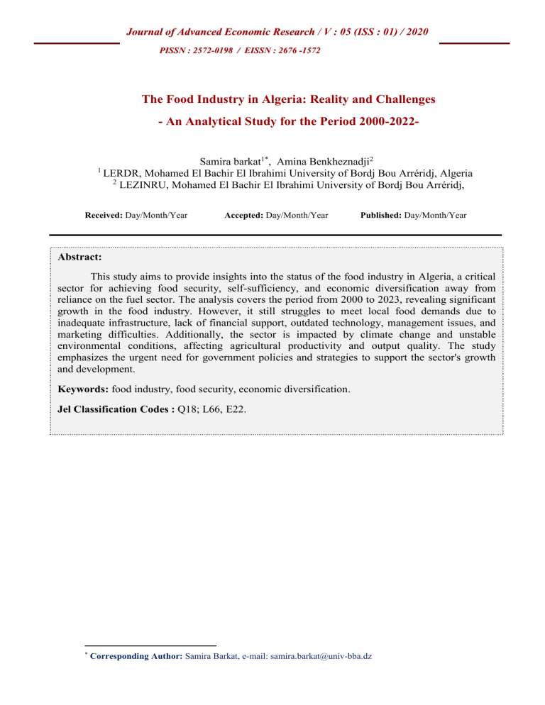 Journal of Advanced Economic Research, El oued University, Eloued, Algeria, Vol
