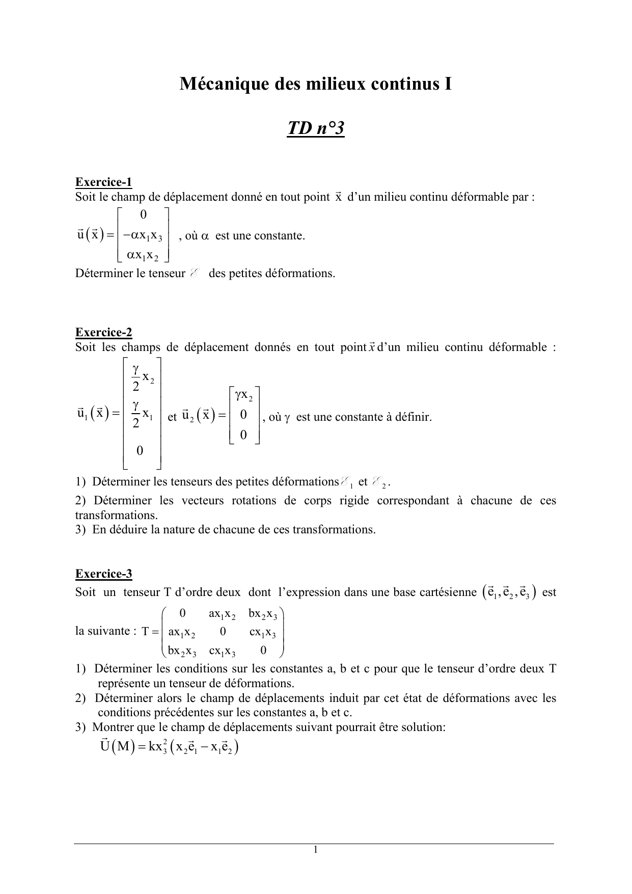 1) Déterminer les tenseurs des petites déformations