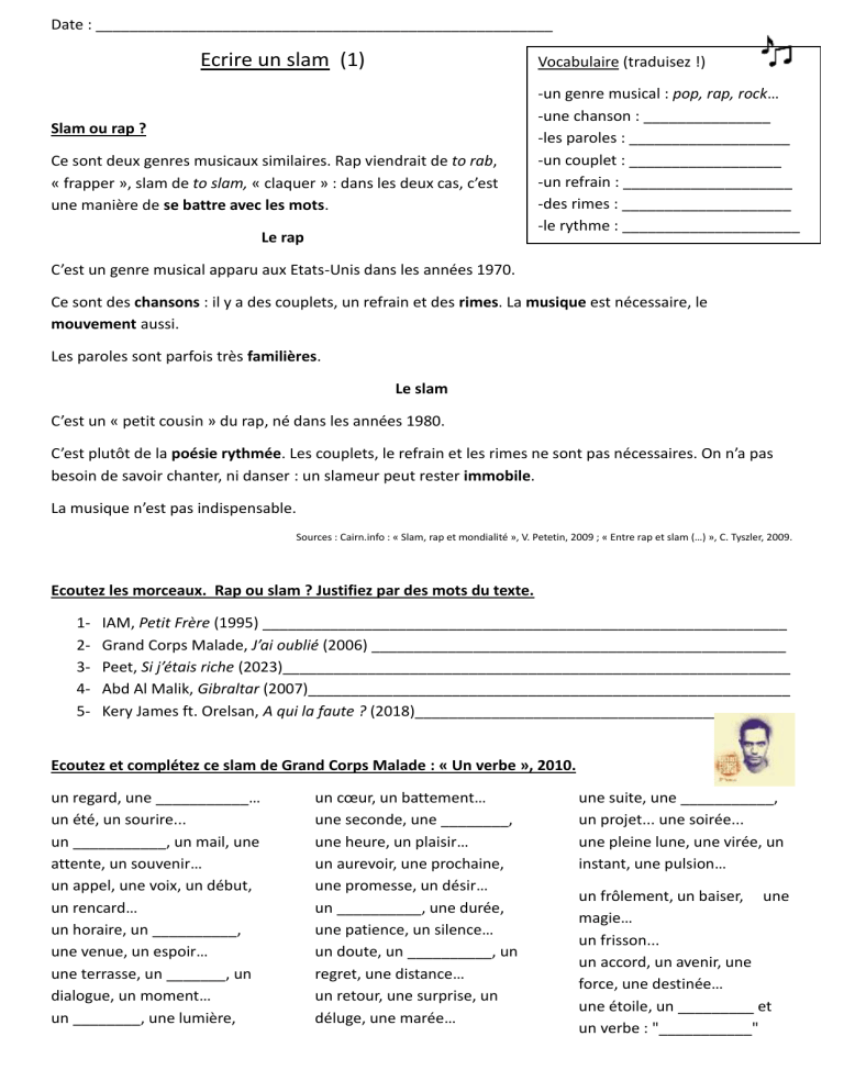 Ecoutez les morceaux. Rap ou slam ? Justifiez par des mots du texte.