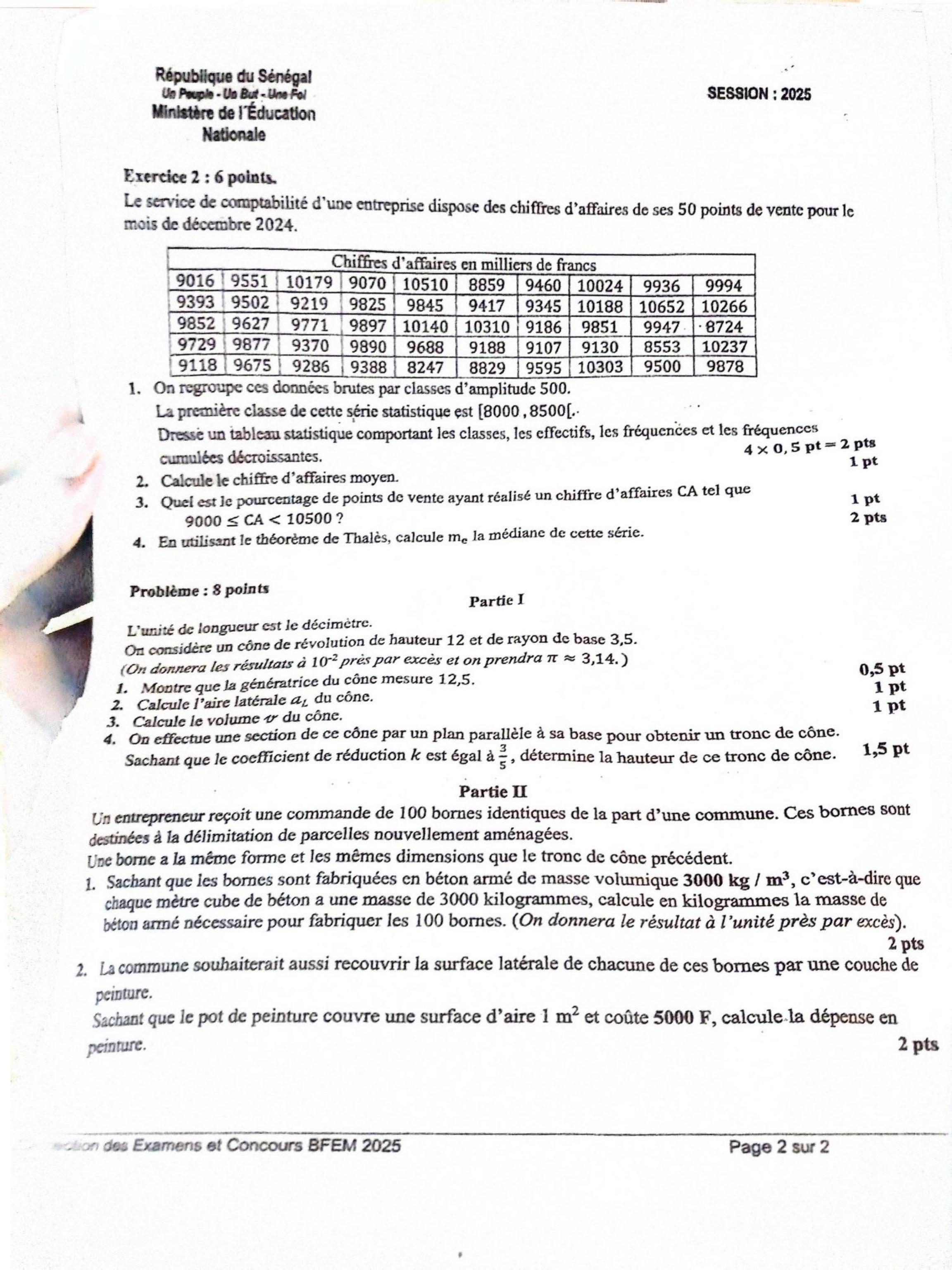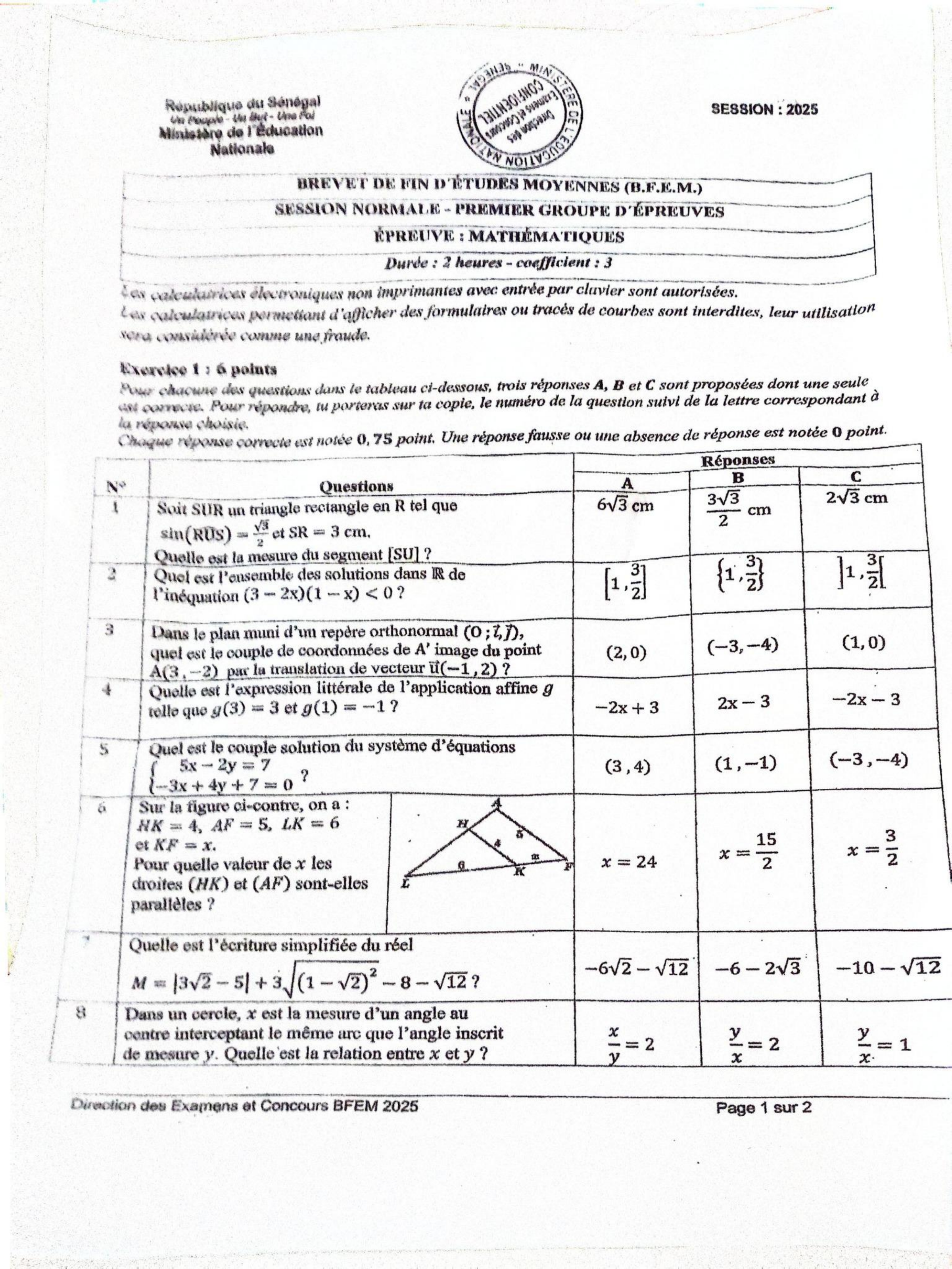 preuve de Mathématiques – BFEM 2025 – Sénégal – Premier Groupe d’Épreuves