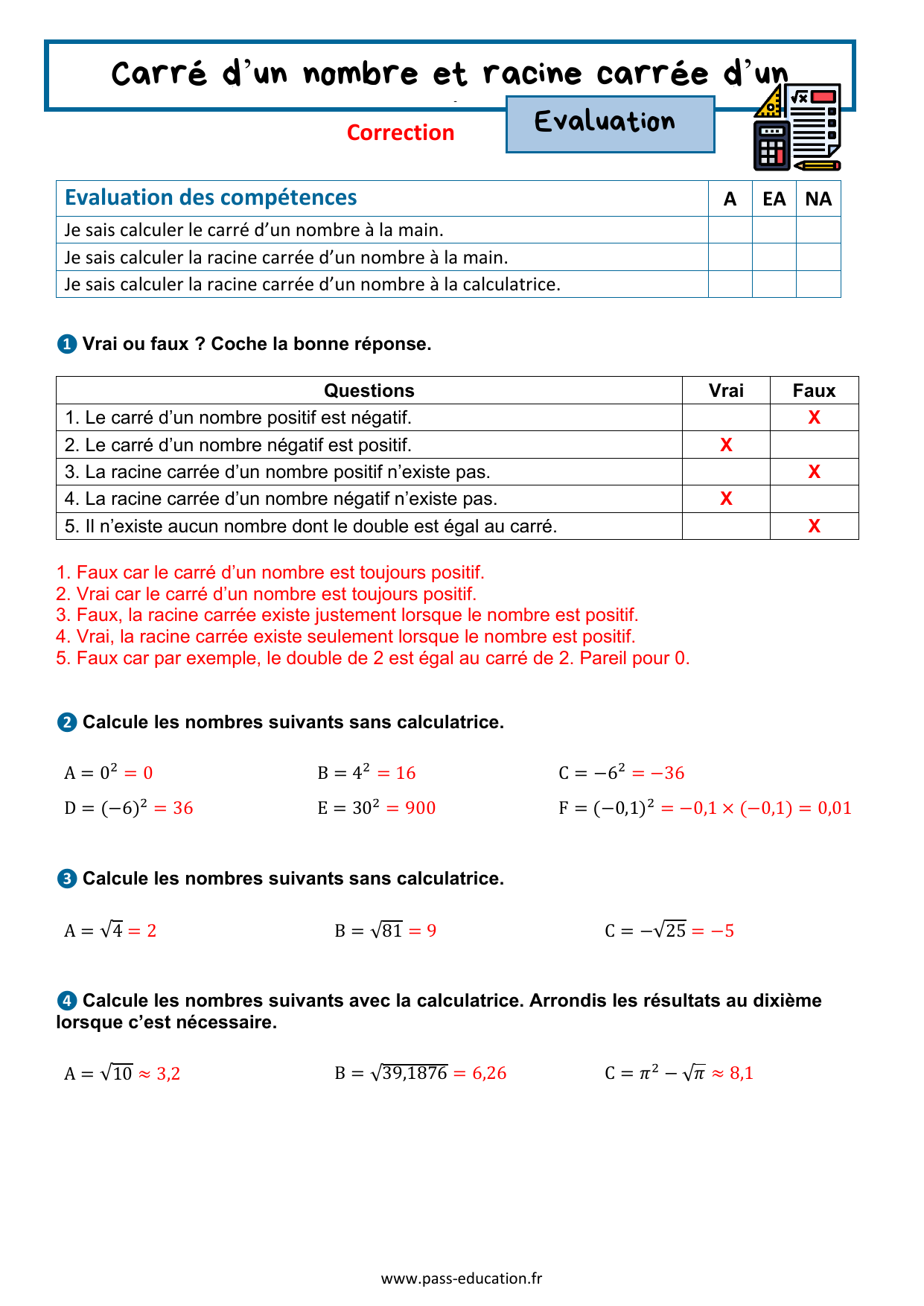•Carré d'un nombre et racine carrée d'un nombre – 4ème – Evaluation avec la correction