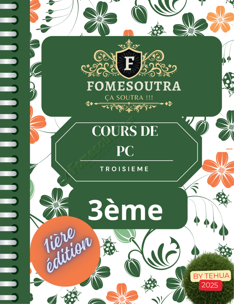 COURS DE PC TROISIEME 3ème BY TEHUA 2025 PROGRESSION DE PHYSIQUE-CHIMIE TROISIÈME (3ème) 2024-2025 OCTOBRE NOVEMBRE DÉCEMBRE 1 2 3 4 5 6 7 8 9 10 11 12 13 THÈMES PHYSIQUE SEPTEMBRE SEMAINES Mécanique TITRES DES LEÇONS Les réactions chimiques SÉANCES Masse et poids d’un corps 1 Les forces 2 Équilibre d’un solide soumis à deux forces 1 Travail et puissance mécaniques 2 Énergie mécanique 1 Congés de Toussaint Évaluation/Remédiation CHIMIE MOIS 1 Électrolyse et synthèse de l'eau 2 Les alcanes 2 Évaluation/Remédiation 1 MARS AVRIL MAI 15 16 17 18 19 20 21 22 23 24 25 26 27 28 29 30 PHYSIQUE FÉVRIER 14 Optique Les réactions chimiques Les lentilles 2 Les défauts de l’œil et leurs corrections Oxydation des corps purs simples Congés de Février Oxydation des corps purs simples (Suite et fin) 1 1 Réduction des oxydes 2 Solutions acides, basiques et neutres 2 Évaluation/Remédiation PHYSIQUE JANVIER CHIMIE Congés de Noël Puissance et énergie électriques 1 1 2 Congés de Pâques Électricité Le conducteur ohmique Évaluation/Remédiation Révision Révision Le Coordonnateur National Disciplinaire AMANI KOUAKOU 2 1 1 1 TROISIEME PHYSIQUE CHIMIE CÔTE D’IVOIRE – ÉCOLE NUMÉRIQUE LEÇON 1 : MASSE ET POIDS D’UN CORPS I-SITUATION D’APPRENTISSAGE Pendant la période d’achat du Cacao dans la région de Bonon, deux élèves en classe de 3ème au Lycée Moderne de ladite ville accompagnent leur père pour la vente de sa récolte. L’acheteur pèse le produit avec une balance romaine puis délivre au père un reçu sur lequel il est marqué : poids : 80 kg. L’un est d’accord avec cette écriture tandis que l’autre ne l’est pas. Le lendemain avec leurs camarades de classe, ils décident de s’informer sur la masse et le poids, les distinguer puis les calculer. II-CONTENU 1- Masse d’un corps 1.1. Notion de masse La masse d’un corps est la grandeur qu’on mesure avec une balance. 1.2. Unités de masse L’unité légale de masse est le kilogramme (kg). On utilise aussi les multiples (t, q) et sous multiples (hg, g, mg …) du kilogramme Remarque : La masse d’un corps ne varie pas d’un lieu à un autre. Activité d’application 1 Le boutiquier du quartier utilise un instrument pour peser du riz. a- Donne le nom de cet instrument. b- Indique la grandeur mesurée avec cet instrument. c- Donne le nom et l’unité dans laquelle s’exprime cette grandeur. d- Dis si cette grandeur change si l’on change de lieu. 2. Masse volumique et densité d’une substance 2.1. Définition et expression La masse volumique d’une substance est la masse de l’unité de volume de cette substance. Elle se note a ou ρ (ro) et son expression est : a= m m ⇔m = a × V ⇔ V = V a ecole-ci.online Page 1 sur 4 2.2. Unités L’unité légale de masse volumique est le kilogramme par mètre cube (kg/m3). Les unités usuelles sont : g/cm3, kg/dm3, t/m 3 NB : Ces unités sont toutes équivalentes. 1g/cm3 = 1kg/dm3 = 1t/m3 2.3. Densité La densité d’un corps est le rapport de sa masse volumique par celle de l’eau. Elle se note d et s’exprime sans unité. dS aS aeau Activité d’application 2 Un objet en bois a une masse m = 600 g. Son volume v = 1 000 cm3. 1- Donne l’expression de la masse volumique d’un corps. 2- Détermine la masse volumique de ce bois en g/cm3 puis en kg/dm3. 3- Détermine sa densité 3. Poids d’un corps 3.1. Définition Le poids d’un corps est la force d’attraction que la terre exerce sur ce corps. Le poids se note P. Il se mesure avec un dynamomètre. 3.2. Unité Le poids d’un corps s’exprime en Newton. Son symbole est N 4. Relation entre poids et masse 4.1. Expérience On mesure le poids P de différentes masses marquées à l’aide d’un dynamomètre. 4.2. Tableau de mesure et exploitation des résultats. Masse m (kg) 0,1 0,2 0,5 10 Poids (N) 1 2 5 10 P/m (N/kg) 10 10 10 10 ecole-ci.online Page 2 sur 4 Le quotient P/m est constant. P et m sont proportionnels. Le coefficient de proportionnalité est appelé intensité de la pesanteur et se note g 4.3. Conclusion : La relation entre le poids P et la masse m est : m en kg P = m × g avec P en Newton (N) g en N / kg Remarque : g varie selon le lieu de même que le poids P. Exemples Lieu Valeur de g (N/kg) Abidjan Paris Lune Mars 9,78 9,81 1,6 3,6 Activité d’application 3 La masse d’un paquet de ciment est m = 50 kg. a- Donne l’expression du poids en fonction de la masse d’un objet. b- Détermine le poids du sac de ciment en un lieu où g = 10 N/kg. c- On transporte le paquet de ciment en un lieu où g = 1,6 N/kg. Détermine le poids du paquet de ciment en ce lieu. III-SITUATION D’EVALUATION Un élève de 3ème de Bonon, allant à l’école découvre une boule brillante de forme sphérique. Attiré par cette boule, il décide de connaitre sa nature. Pour cela il réalise avec ses camarades les expériences ci-dessous. 4,45 N V2 = 160 cm3 V1 = 110 cm3 Figure 1 Figure 2 Substance Masse volumique ecole-ci.online Figure 3 Page 3 sur 4 On donne : g = 10 N/kg Aluminium 2,7 g/cm3 Cuivre 8,9 g/cm3 Or 19,3 g/cm3 Tu es appelé à exploiter ces expériences afin de déterminer la nature de cette boule. 1- On considère l’expérience de la figure 3 1.1. Nomme l’appareil utilisé et donne son rôle. 1.2. Donne la valeur du poids de la boule. 2- Détermine la masse de la boule 3- Calcule le volume de la boule. 4- Détermine : 4.1. la masse volumique de la boule. 4.2. la nature de la boule en te servant du tableau ci-dessus. IV-EXERCICES EXERCICE 1 Un solide accroché à un dynamomètre indique 4 N. 1- Dis ce que représente cette indication. 2- Détermine la masse de ce solide. On prendra g = 10 N/kg. EXERCICE 2 Un objet en bois a une masse m = 600 g. Son volume v = 1 000 cm3. 1- Donne l’expression de la masse volumique d’un corps. 2- Détermine la masse volumique de ce bois en g/cm3 puis en kg/dm3. 3- Détermine sa densité. EXERCICE 3 La masse d’un paquet de ciment es