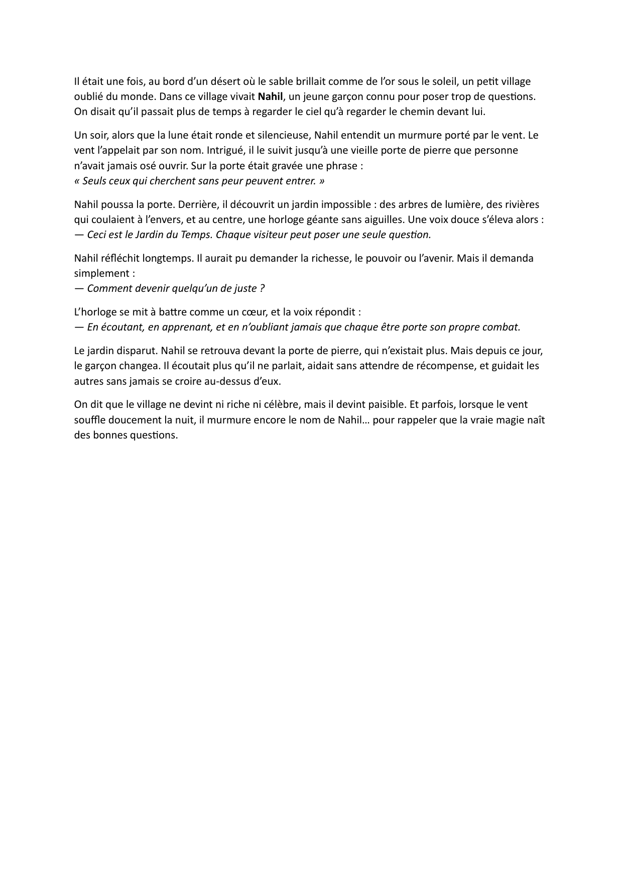 Le jardin disparut. Nahil se retrouva devant la porte de pierre, qui n’existait plus. Mais depuis ce jour,