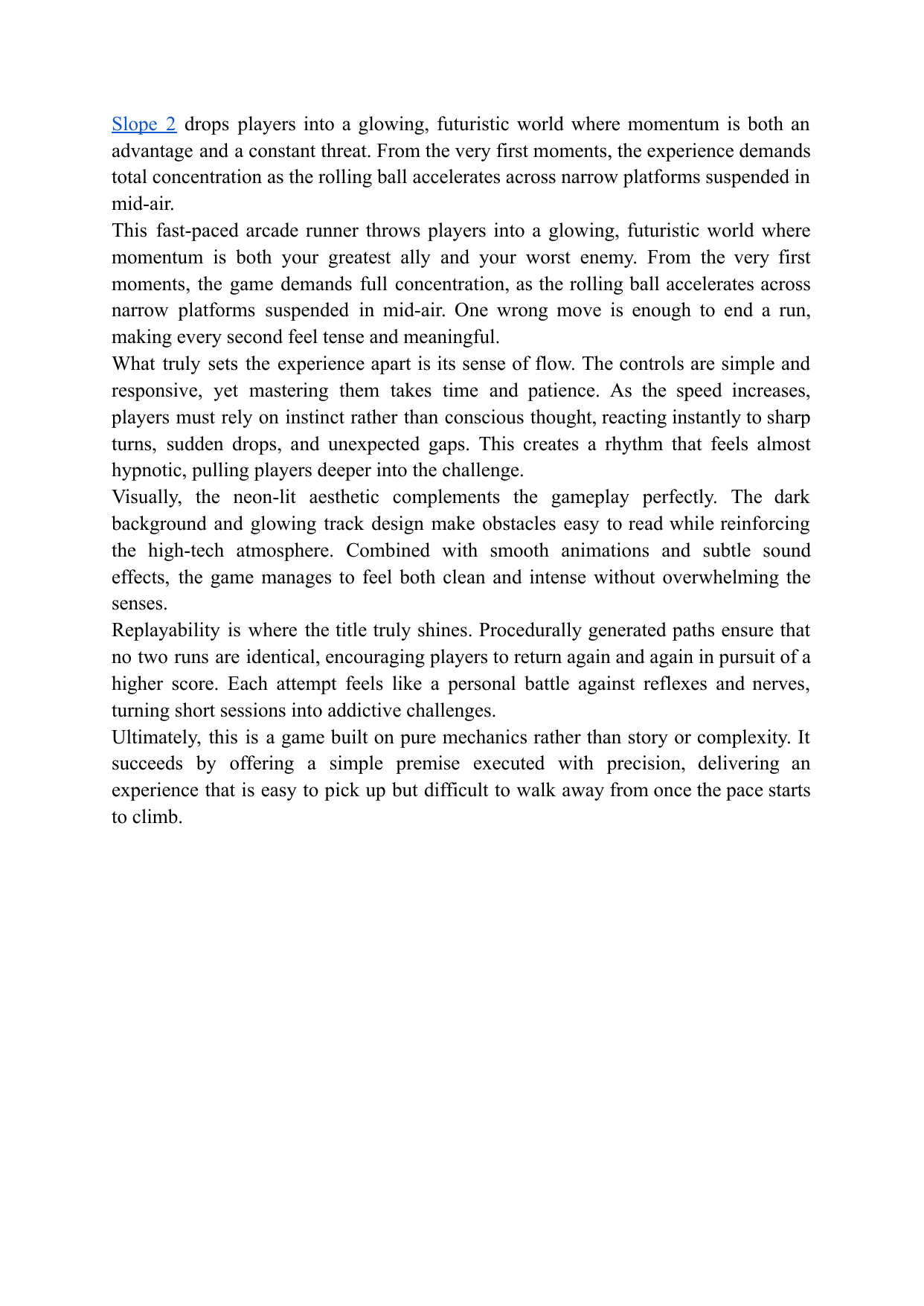 Slope 2 drops players into a glowing, futuristic world where momentum is both an