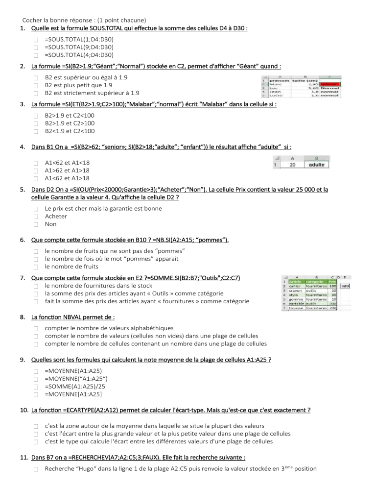 1. Quelle est la formule SOUS.TOTAL qui effectue la somme des cellules D4 à D30 :