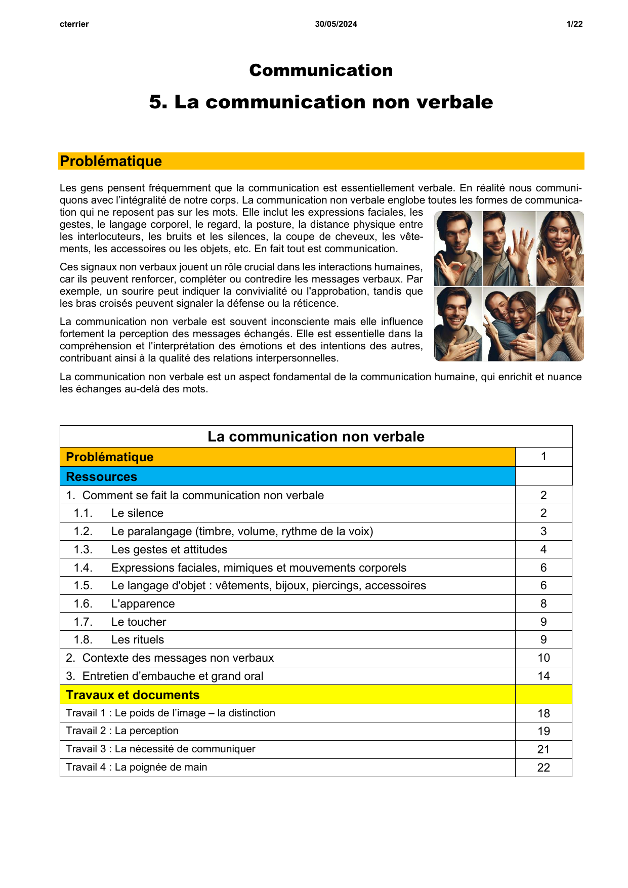 gestes et postures, le ton de notre voix, l'habillement, la coiffure, le maquillage, l’odeur, les silences, le toucher.