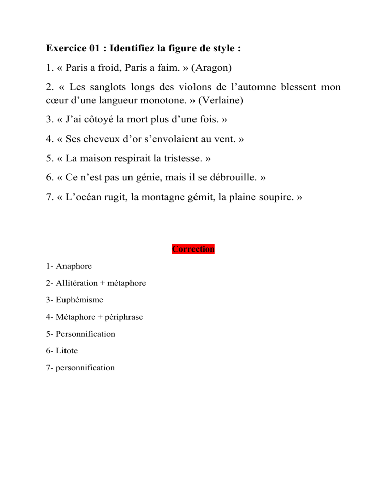 Exercice 01 : Identifiez la figure de style :