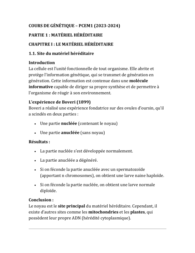 COURS DE GÉNÉTIQUE – PCEM1 (2023-2024)