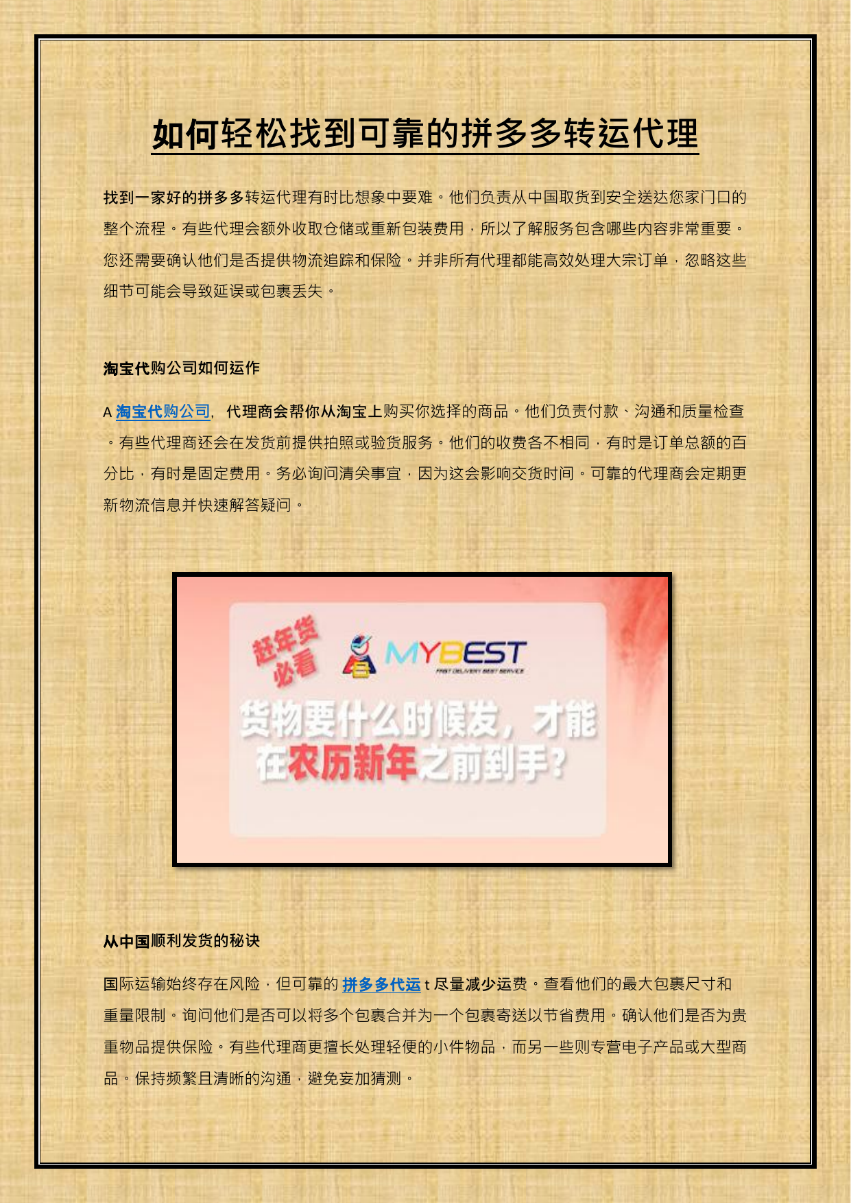 使用可靠的拼多多转运代理或淘宝代购公司可以节省大量时间和精力。像mybest.com.my这样