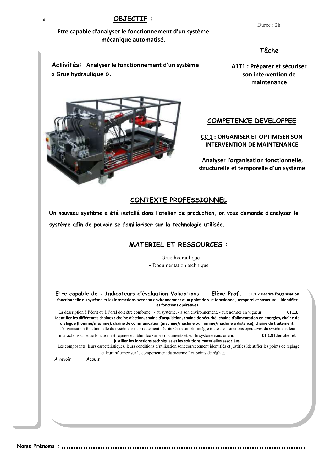 Etre capable de : Indicateurs d’évaluation Validations Elève Prof. C1.1.7 Décrire l’organisation