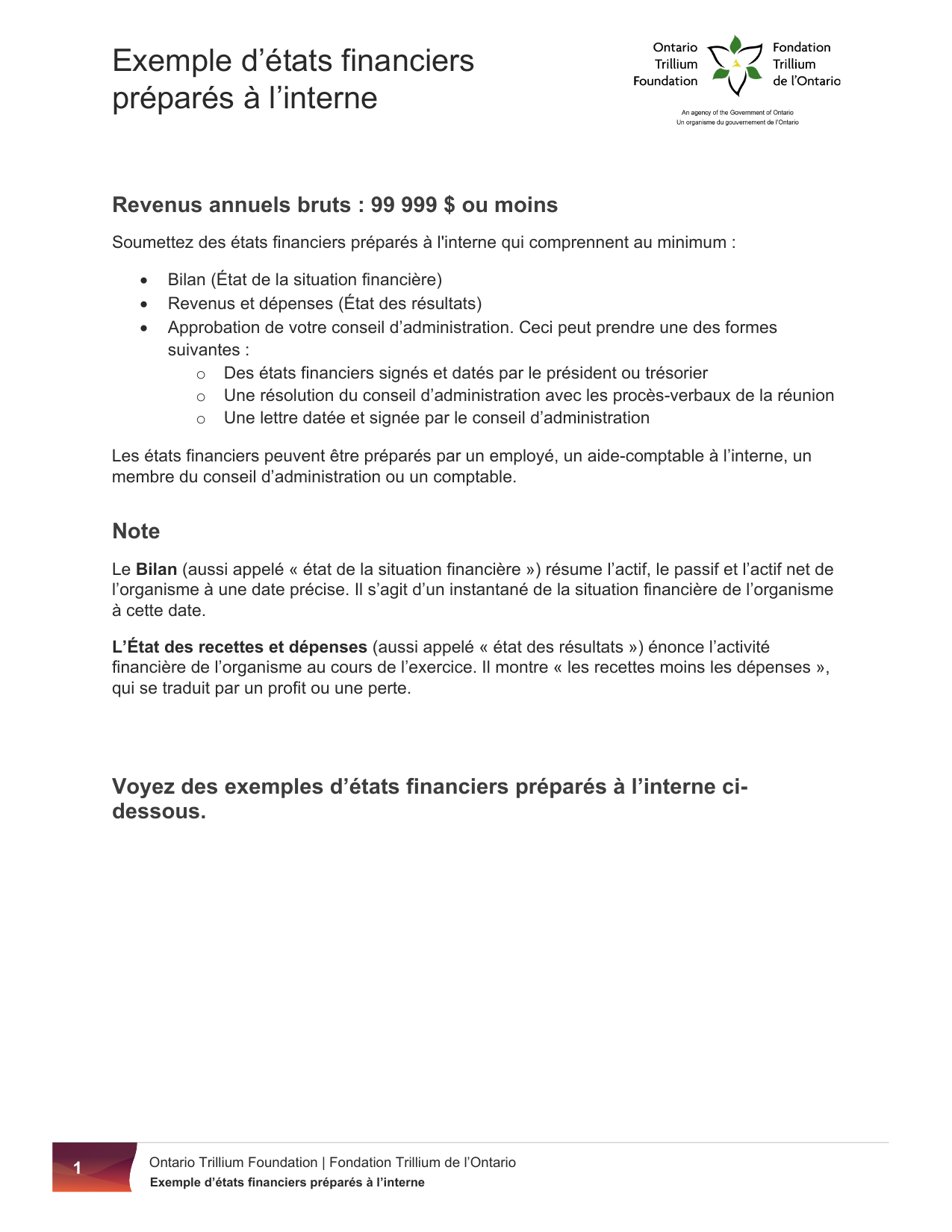 1 Exemple d’états financiers préparés à l’interne