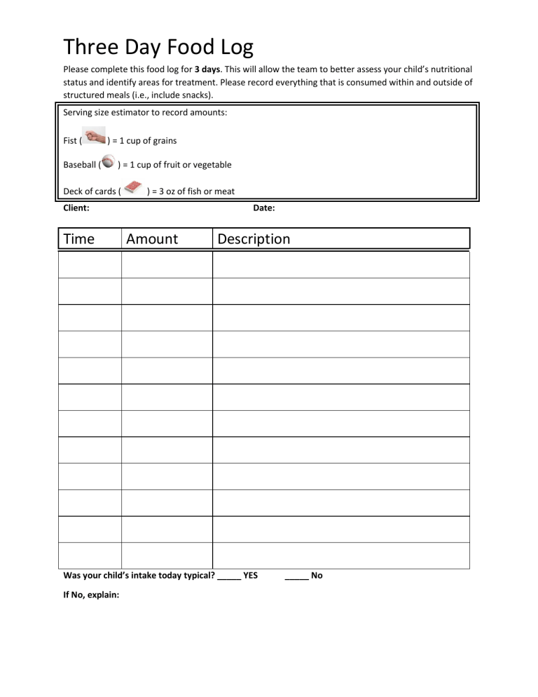 Please complete this food log for 3 days. This will allow the team to better assess your child’s nutritional