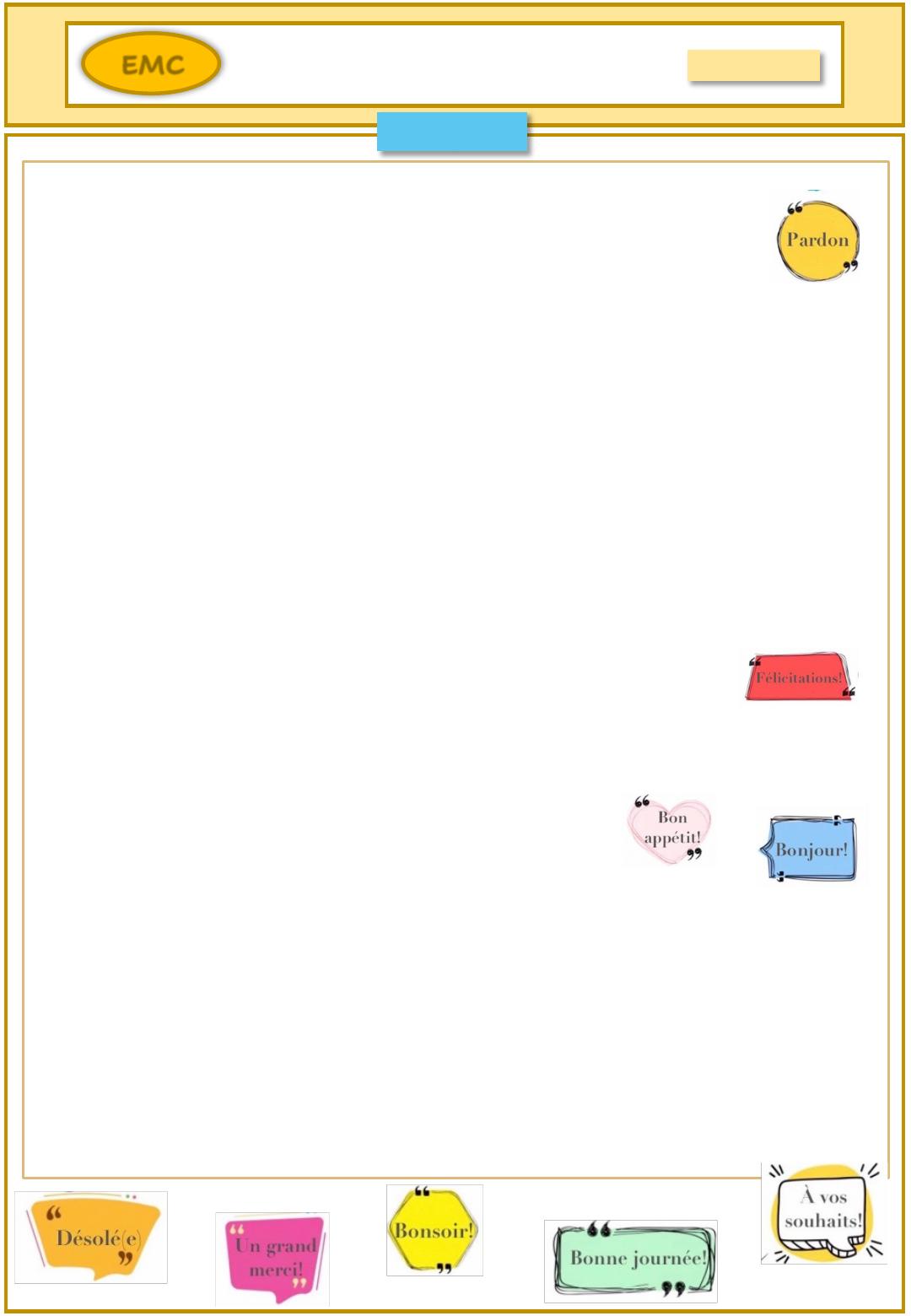 expressions :bonjour, au revoir, s’il vous plaît, merci,