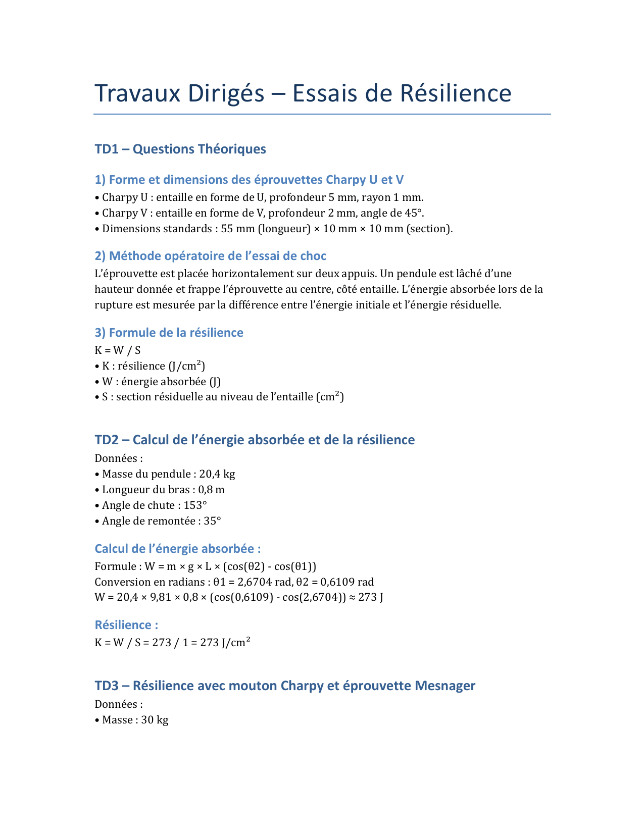 Donnée : Résilience = 100 J/cm², donc W = 100 J, H = 1,40 m, masse supposée = 15 kg