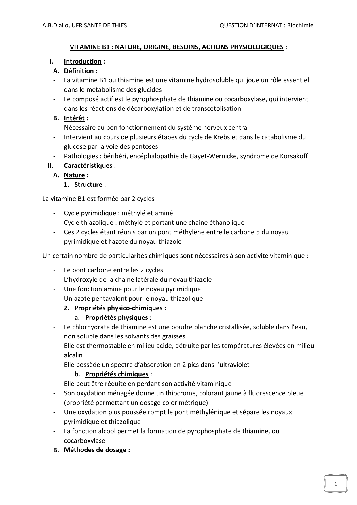 - La vitamine B1 est très répandue dans la nature, sa synthèse est faite par la plupart