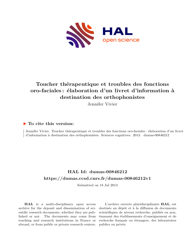 Jennifer Vivier. Toucher thérapeutique et troubles des fonctions oro-faciales : élaboration d’un livret