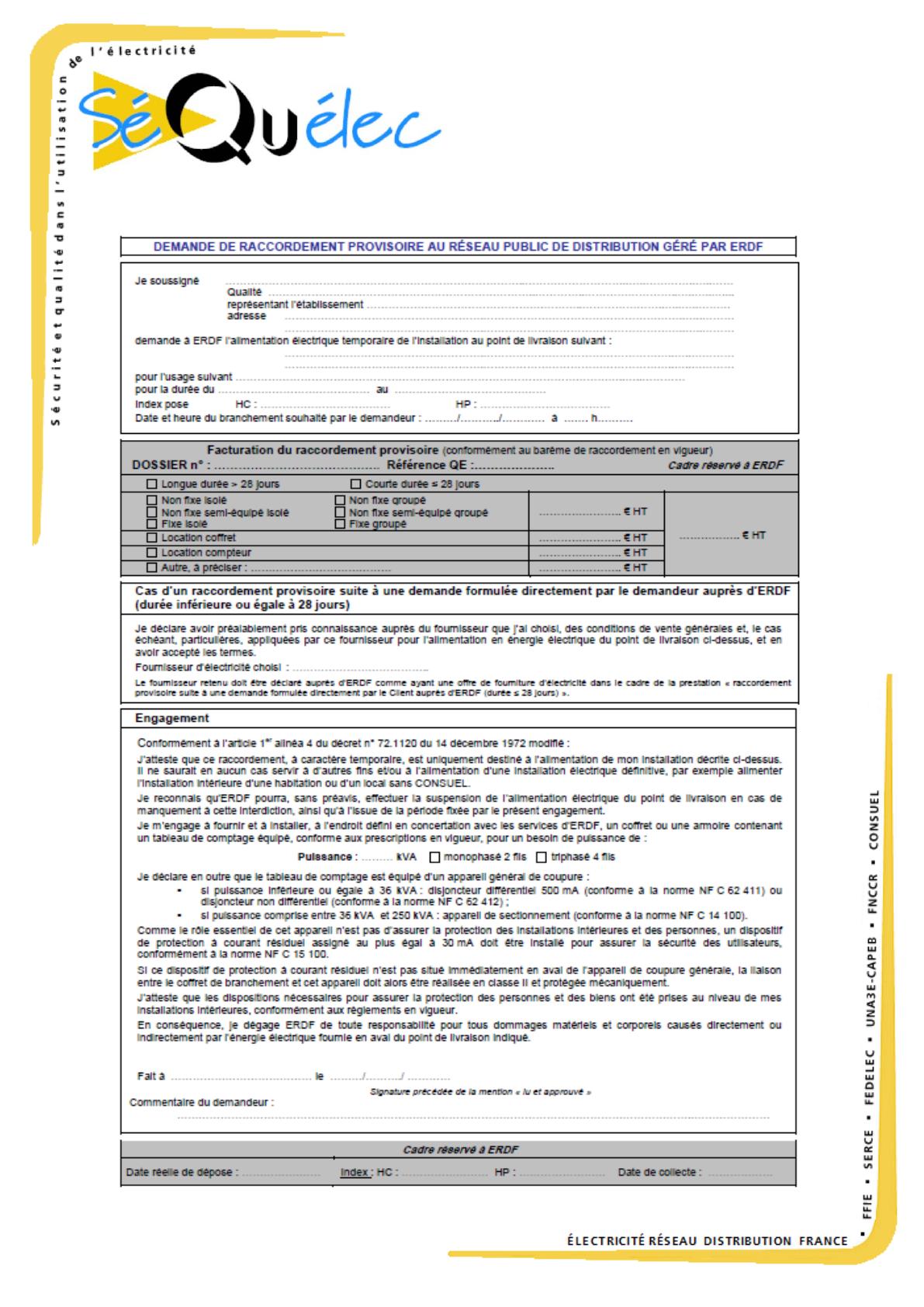 IMPORTANT : Un branchement provisoire ne peut être utili que pour un usage provisoire (chantier, …) ERDF se