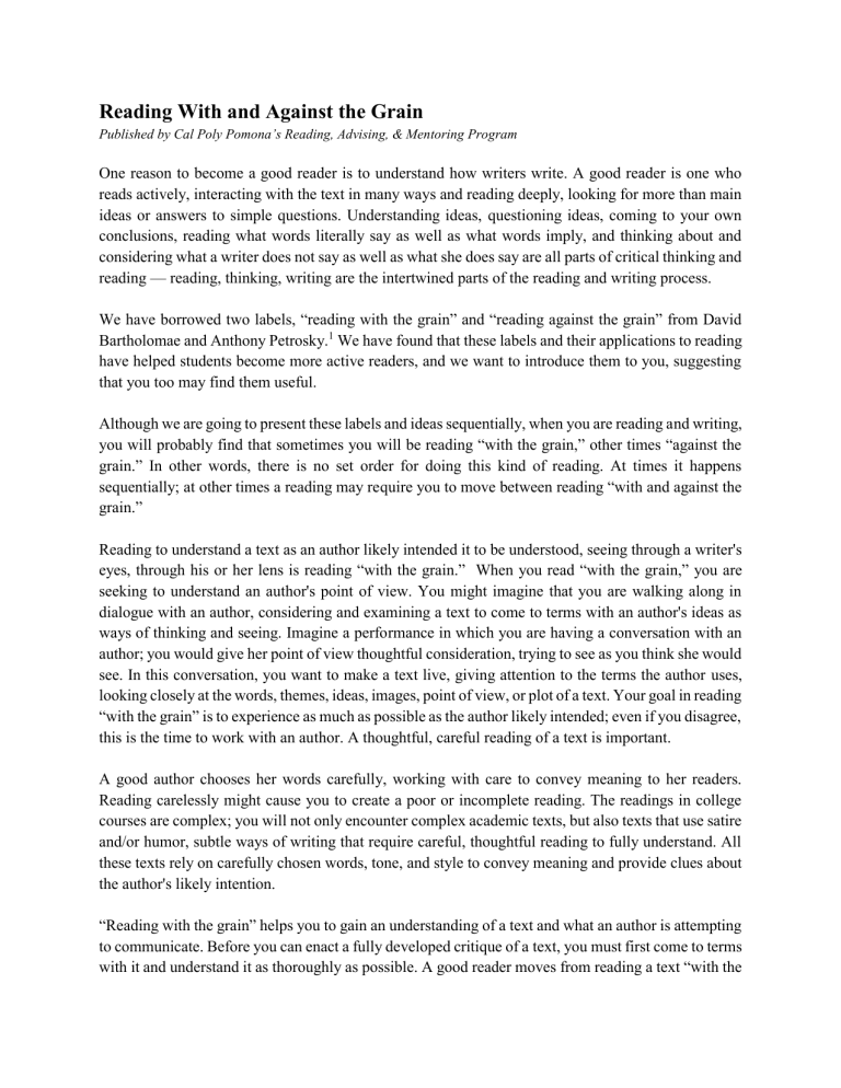 “Reading with the grain” helps you to gain an understanding of a text and what an author is attempting