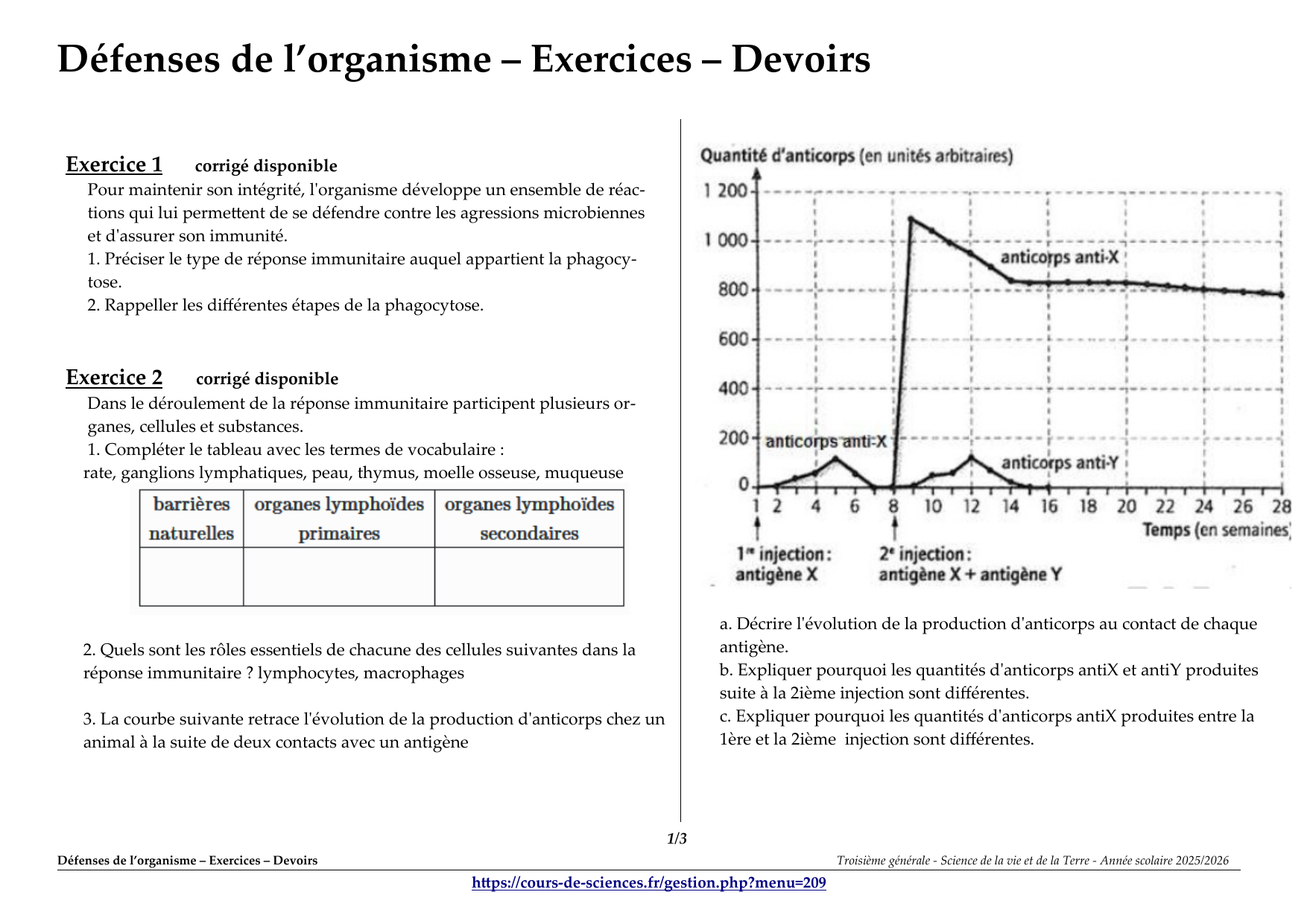 Défenses de l’organisme – Exercices – Devoirs Troisième générale - Science de la vie et de la Terre - Année scolaire 2025/2026
