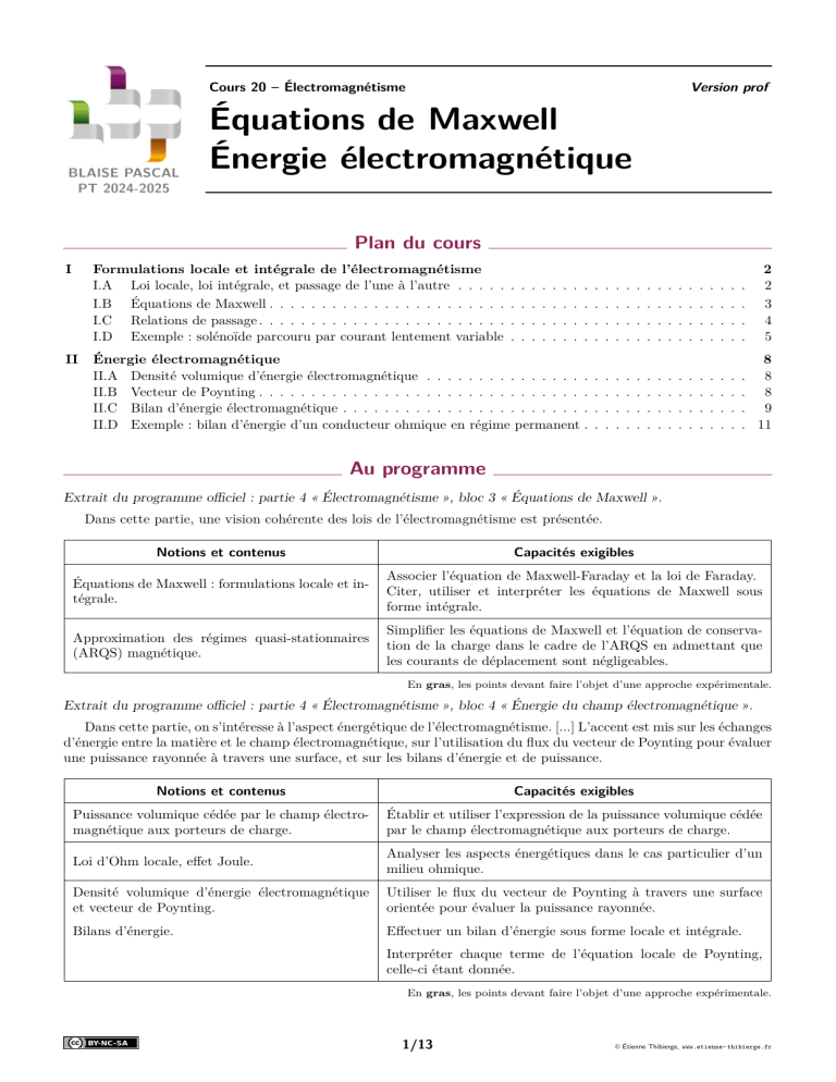 Cours 20 : Équations de Maxwell, énergie électromagnétique Blaise Pascal, PT 2024-2025