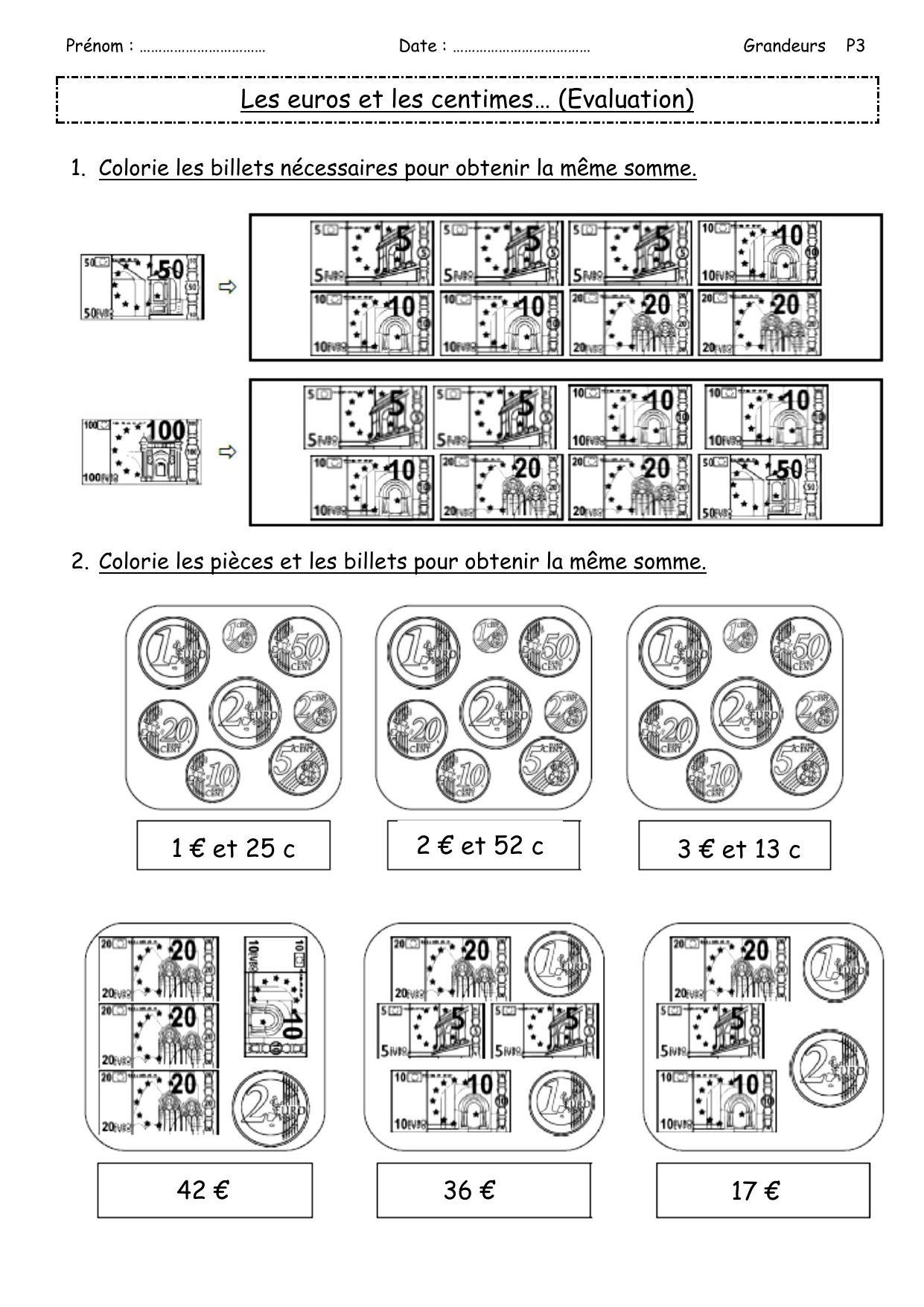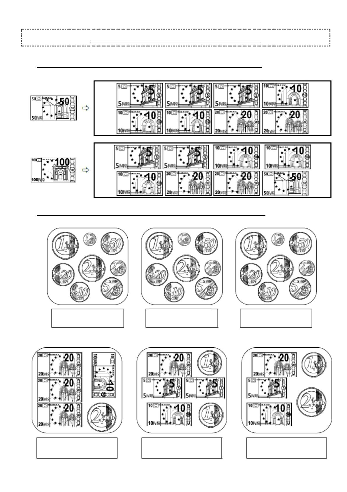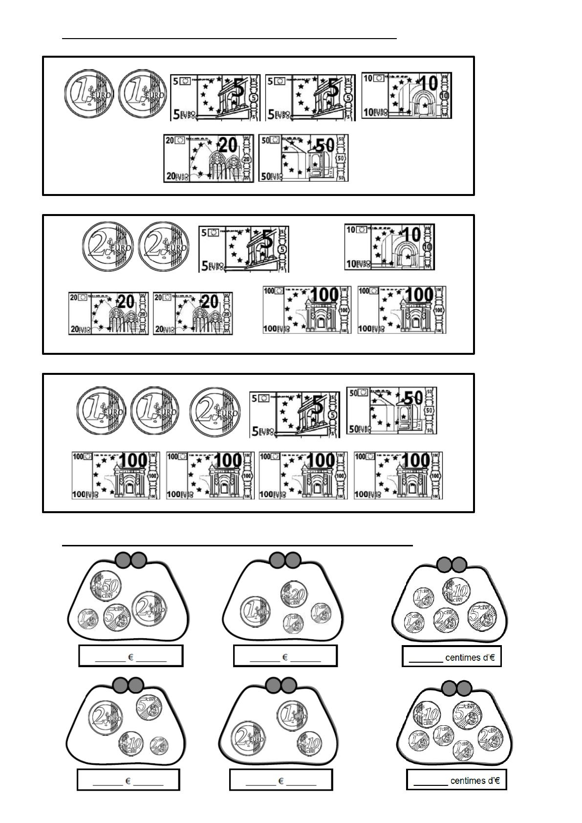 1. Colorie les billets nécessaires pour obtenir la même somme.