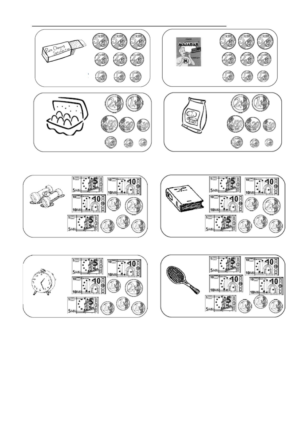 5. Colorie les pièces et billets pour acheter l’élément proposé.