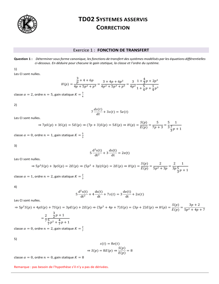 Question 2 : Déterminer sous forme canonique, les fonctions de transfert des systèmes modélisés par les équations différentielles