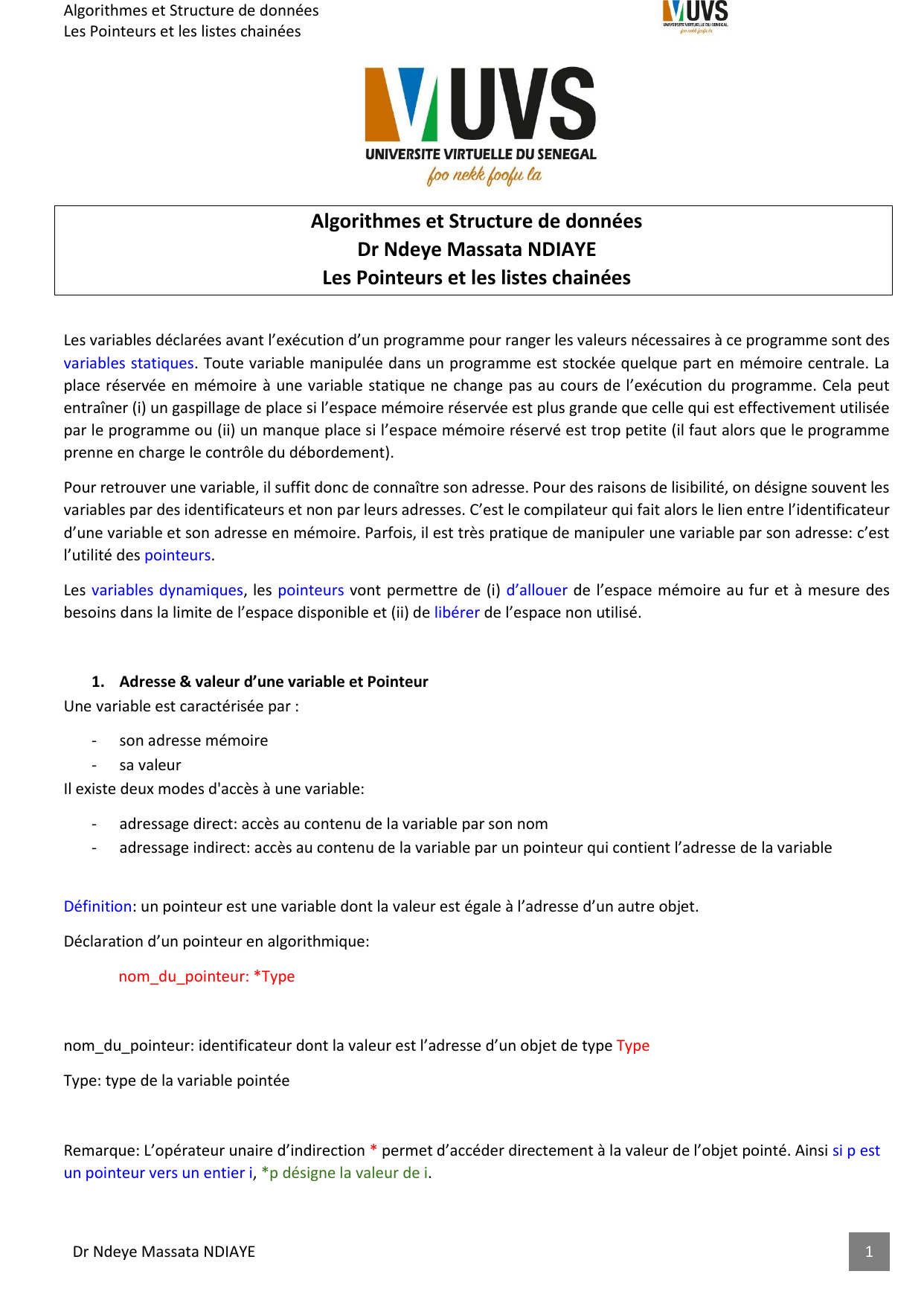 1. Adresse & valeur d’une variable et Pointeur