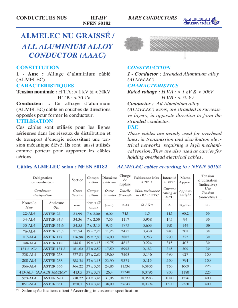 Câbles ALMELEC selon : NFEN 50182 ALMELEC cables according to : NFEN 50182