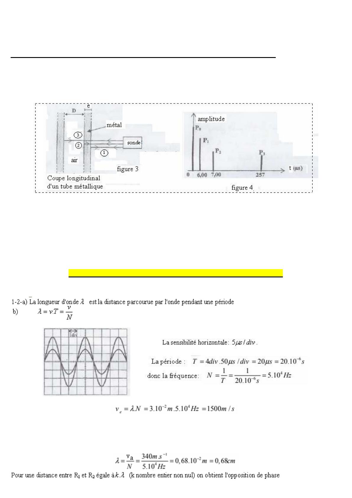 P0 : correspond à l'instant t=0 émission du signal par la sonde. P1 : correspond à l'instant auquel le signal réfléchi 1 a été capté par la sonde. P2 : correspond à l'instant auquel le signal réfléchi 2 a été capté par la sonde. P3 : correspond à l'instant auquel le signal réfléchi 3 a été capté par la sonde. Vitesse de propagation des ondes ultrasonores : -dans le tube métallique : vm=104m/s. -dans l'air : va=340m/s.