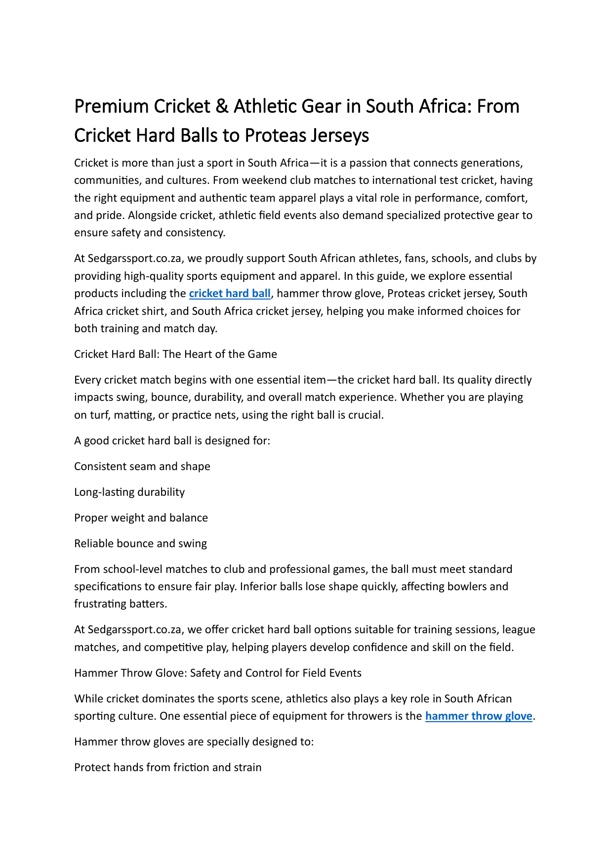 products including the cricket hard ball, hammer throw glove, Proteas cricket jersey, South