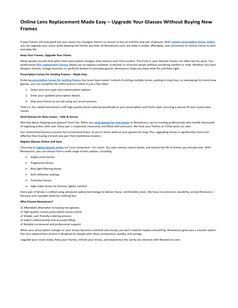 Online Lens Replacement Made Easy – Upgrade Your Glasses Without Buying New Frames If your frames still look great but your vision has changed, there’s no reason to buy an entirely new pair of glasses. With custom prescription lenses online, you can upgrade your vision while keeping the frames you love. At RenewLens.com, we make it simple, affordable, and convenient to restore clarity to your everyday life. Keep Your Frames. Upgrade Your Vision. Many people assume that when their prescription changes, they need to start from scratch. The truth is, your favorite frames can often last for years. Our professional lens replacement service allows you to replace outdated, scratched, or incorrect lenses without sacrificing comfort or style. Whether you have designer frames, vintage favorites, or perfectly broken-in everyday glasses, RenewLens helps you keep what fits and feels right. Prescription Lenses for Existing Frames – Made Easy Ordering prescription lenses for existing frames has never been easier. Instead of visiting multiple stores, waiting in long lines, or overpaying for brand-new glasses, you can complete the entire process online in just a few steps: 1. Select your lens type and customization options. 2. Enter your updated prescription details. 3. Ship your frames to our lab using our secure process. That’s it. Our skilled technicians craft high-quality lenses tailored specifically to your prescription and frame style, ensuring a precise fit and crystal-clear results. Send Glasses for New Lenses – Safe & Secure Worried about shipping your glasses? Don’t be. When you send glasses for new lenses to RenewLens, you’re trusting professionals who handle thousands of reglazing orders with care. Every pair is inspected, measured, and fitted with precision. We treat your frames as if they were our own. Our streamlined process ensures fast turnaround times, so you’re never without your glasses for long. Plus, upgrading lenses is significantly more costeffective than buying a brand-new pair from traditional retailers. Reglaze Glasses Online and Save Choosing to reglaze glasses online isn’t just convenient—it’s smart. You save money, reduce waste, and extend the life of frames you already love. With RenewLens, you can choose from a wide range of lens options, including: • Single vision lenses • Progressive lenses • Blue light filtering lenses • Anti-reflective coatings • Transition lenses • High-index lenses for thinner, lighter comfort Every pair of lenses is crafted using advanced optical technology to deliver sharp, comfortable vision. We focus on precision, durability, and performance— because your eyesight deserves nothing less. Why Choose RenewLens? ✔ Affordable alternative to buying new glasses ✔ High-quality custom prescription lenses online ✔ Simple, user-friendly ordering process ✔ Expert craftsmanship and accurate fitting ✔ Reliable turnaround and professional support When your prescription changes or your lenses become scratched and cloudy, you don’t need to replace everything. RenewLens gives you a smarter option. Our lens replacement service is designed for people who value convenience, quality, and savings. Upgrade your vision today. Keep your frames, refresh your lenses, and experience the clarity you deserve with RenewLens.com.