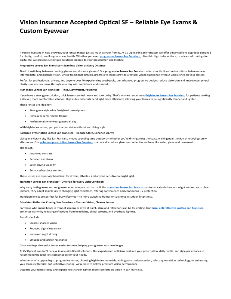 Vision Insurance Accepted Optical SF – Reliable Eye Exams & Custom Eyewear If you’re investing in new eyewear, your lenses matter just as much as your frames. At CV Optical in San Francisco, we offer advanced lens upgrades designed for clarity, comfort, and long-term eye health. Whether you need progressive lenses San Francisco, ultra-thin high index options, or advanced coatings for digital life, we provide customized solutions tailored to your prescription and lifestyle. Progressive Lenses San Francisco – Seamless Vision at Every Distance Tired of switching between reading glasses and distance glasses? Our progressive lenses San Francisco offer smooth, line-free transitions between near, intermediate, and distance vision. Unlike traditional bifocals, progressive lenses provide a natural visual experience without visible lines on your glasses. Perfect for professionals, drivers, and anyone over 40 experiencing presbyopia, our advanced progressive designs reduce distortion and improve peripheral clarity—so you can move through your day with confidence and comfort. High Index Lenses San Francisco – Thin, Lightweight, Powerful If you have a strong prescription, thick lenses can feel heavy and look bulky. That’s why we recommend high index lenses San Francisco for patients seeking a sleeker, more comfortable solution. High index materials bend light more efficiently, allowing your lenses to be significantly thinner and lighter. These lenses are ideal for: • Strong nearsighted or farsighted prescriptions • Rimless or semi-rimless frames • Professionals who wear glasses all day With high index lenses, you get sharper vision without sacrificing style. Polarized Prescription Lenses San Francisco – Reduce Glare, Enhance Clarity Living in a vibrant city like San Francisco means spending time outdoors—whether you’re driving along the coast, walking near the Bay, or enjoying sunny afternoons. Our polarized prescription lenses San Francisco dramatically reduce glare from reflective surfaces like water, glass, and pavement. The result? • Improved contrast • Reduced eye strain • Safer driving visibility • Enhanced outdoor comfort These lenses are especially beneficial for drivers, athletes, and anyone sensitive to bright light. Transition Lenses San Francisco – One Pair for Every Light Condition Why carry both glasses and sunglasses when one pair can do it all? Our transition lenses San Francisco automatically darken in sunlight and return to clear indoors. They adapt seamlessly to changing light conditions, offering convenience and continuous UV protection. Transition lenses are perfect for busy lifestyles—no more switching frames or squinting in sudden brightness. Crizal Anti Reflective Coating San Francisco – Sharper Vision, Cleaner Lenses For those who spend hours in front of screens or drive at night, glare and reflections can be frustrating. Our Crizal anti reflective coating San Francisco enhances clarity by reducing reflections from headlights, digital screens, and overhead lighting. Benefits include: • Clearer, sharper vision • Reduced digital eye strain • Improved night driving • Smudge and scratch resistance Crizal coatings also make lenses easier to clean, helping your glasses look new longer. At CV Optical, we don’t believe in one-size-fits-all solutions. Our experienced opticians evaluate your prescription, daily habits, and style preferences to recommend the ideal lens combination for your needs. Whether you’re upgrading to progressive lenses, choosing high index materials, adding polarized protection, selecting transition technology, or enhancing your lenses with Crizal anti-reflective coating, we’re here to deliver premium vision performance. Upgrade your lenses today and experience sharper, lighter, more comfortable vision in San Francisco.