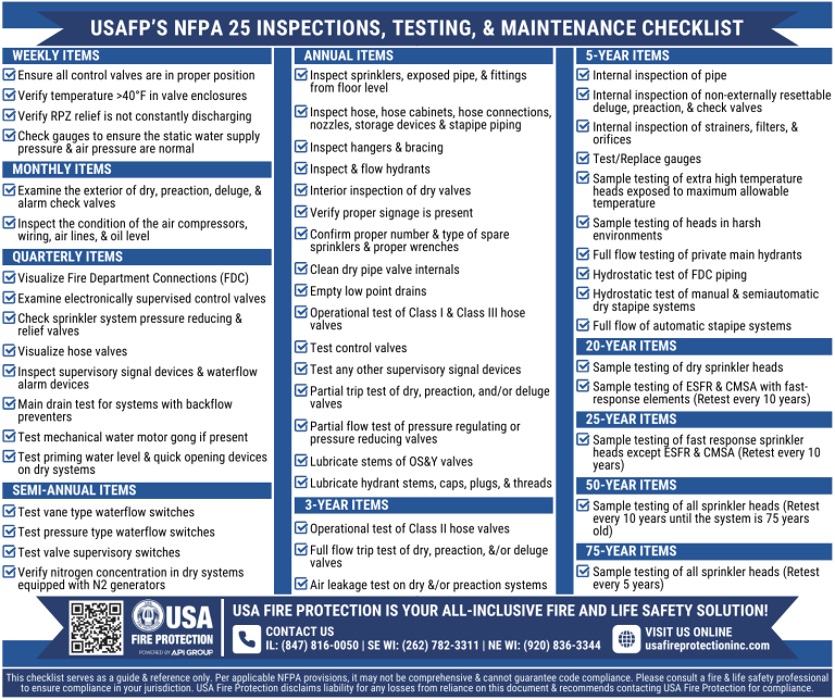 USAFP’S NFPA 25 INSPECTIONS, TESTING, & MAINTENANCE CHECKLIST WEEKLY ITEMS ANNUAL ITEMS 5-YEAR ITEMS Ensure all control valves are in proper position Inspect sprinklers, exposed pipe, & fittings from floor level Internal inspection of pipe Verify temperature >40°F in valve enclosures Inspect hose, hose cabinets, hose connections, nozzles, storage devices & stapipe piping Verify RPZ relief is not constantly discharging Check gauges to ensure the static water supply pressure & air pressure are normal Inspect hangers & bracing MONTHLY ITEMS Inspect & flow hydrants Examine the exterior of dry, preaction, deluge, & alarm check valves Interior inspection of dry valves Verify proper signage is present Inspect the condition of the air compressors, wiring, air lines, & oil level Confirm proper number & type of spare sprinklers & proper wrenches QUARTERLY ITEMS Clean dry pipe valve internals Visualize Fire Department Connections (FDC) Examine electronically supervised control valves Empty low point drains Internal inspection of non-externally resettable deluge, preaction, & check valves Internal inspection of strainers, filters, & orifices Test/Replace gauges Sample testing of extra high temperature heads exposed to maximum allowable temperature Sample testing of heads in harsh environments Full flow testing of private main hydrants Hydrostatic test of FDC piping Hydrostatic test of manual & semiautomatic dry stapipe systems Check sprinkler system pressure reducing & relief valves Operational test of Class I & Class III hose valves Visualize hose valves Test control valves 20-YEAR ITEMS Inspect supervisory signal devices & waterflow alarm devices Test any other supervisory signal devices Sample testing of dry sprinkler heads Partial trip test of dry, preaction, and/or deluge valves Sample testing of ESFR & CMSA with fastresponse elements (Retest every 10 years) Main drain test for systems with backflow preventers Full flow of automatic stapipe systems 25-YEAR ITEMS Test mechanical water motor gong if present Partial flow test of pressure regulating or pressure reducing valves Test priming water level & quick opening devices on dry systems Lubricate stems of OS&Y valves Sample testing of fast response sprinkler heads except ESFR & CMSA (Retest every 10 years) Lubricate hydrant stems, caps, plugs, & threads 50-YEAR ITEMS Test vane type waterflow switches 3-YEAR ITEMS Test pressure type waterflow switches Operational test of Class II hose valves Sample testing of all sprinkler heads (Retest every 10 years until the system is 75 years old) Test valve supervisory switches Full flow trip test of dry, preaction, &/or deluge valves SEMI-ANNUAL ITEMS Verify nitrogen concentration in dry systems equipped with N2 generators Air leakage test on dry &/or preaction systems 75-YEAR ITEMS Sample testing of all sprinkler heads (Retest every 5 years) USA FIRE PROTECTION IS YOUR ALL-INCLUSIVE FIRE AND LIFE SAFETY SOLUTION! CONTACT US US ONLINE VISIT USVISIT ONLINE IL: (847) 816-0050 | SE WI: (262) 782-3311 | NE WI: (920) 836-3344 usafireprotectioninc.com usafireprotectioninc.com This checklist serves as a guide & reference only. Per applicable NFPA provisions, it may not be comprehensive & cannot guarantee code compliance. Please consult a fire & life safety professional to ensure compliance in your jurisdiction. USA Fire Protection disclaims liability for any losses from reliance on this document & recommends contacting USA Fire Protection for compliance.