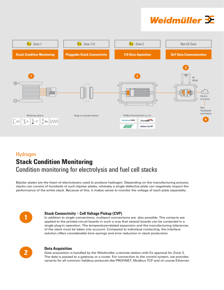 Hydrogen Stack Condition Monitoring Condition monitoring for electrolysis and fuel cell stacks Bipolar plates are the heart of electrolysers used to produce hydrogen. Depending on the manufacturing process, stacks can consist of hundreds of such bipolar plates, whereby a single defective plate can negatively impact the performance of the entire stack. Because of this, it makes sense to monitor the voltage of each plate separately. Stack Connectivity – Cell Voltage Pickup (CVP) In addition to single connections, multiport connections are also possible. The contacts are applied to the printed circuit boards in such a way that several boards can be contacted in a single plug-in operation. The temperature-related expansion and the manufacturing tolerances of the stack must be taken into account. Compared to individual contacting, the interface solution offers considerable time savings and error reduction in stack production. Data Acquisition Data acquisition is handled by the Weidmüller u-remote station with Ex approval for Zone 2. The data is passed to a gateway or a router. For connection to the control system, we provides variants for all common fieldbus protocols like PROFINET, Modbus TCP and of course Ethernet. IIoT Data Communication In addition to the LAN connection, a connection via IoT-boxes to the customer's cloud or the Weidmüller cloud is also possible. This also makes it possible to monitor the depositing of stationary equipment externally. In addition to the system operator, the stack manufacturer can also access the system remotely for diagnostics, service and support. This is used for preventive maintenance and to maximise the system's operating time. Data Visualisation and Analysis With our visualisation hardware and software solutions, we enable real-time data acquisition from stacks, empowering manufacturers and operators to monitor crucial parameters and identify potential failures like cell degradation, gas crossover, leaks, sealing issues, and stack contamination. Our integrated approach ensures seamless data flow from the stack to ProconWeb, where it can be fed into our on-premise or cloud-based Automated Machine Learning (AML) tool. More information on our website: www.weidmueller.com/stack-monitoring Cell Voltage Measurement Box Cell voltage measurement for stacks: electrolyser, fuel cells & BESS The Cell Voltage Measurement Box (CVM) enables the differential voltage measurement of individual cells for electrolysis stacks, fuel and battery cells for data collection and analysis in hydrogen systems. It is compatible with manufacturer and fulfils all customer requirements in the hydrogen industry, including the necessary certifications. What makes it special: The box is plug-and-play ready, modular and ideally suited for industrialisation and a rapid ramp-up of the H2 industry. More information on our website: www.weidmueller.com/cvm-box Activate the power of new energies with us. Take the opportunity to talk to us about your individual project. We look forward to a dialogue with you! Weidmüller Interface GmbH & Co. KG Klingenbergstraße 26 32758 Detmold, Germany Telefon +49 5231 14-0 Telefax +49 5231 14-292083 www.weidmueller.de Your contact person: Cengiz Oguzoglu Global Business Development Manager Hydrogen [email protected] Made in Germany | 09/2024